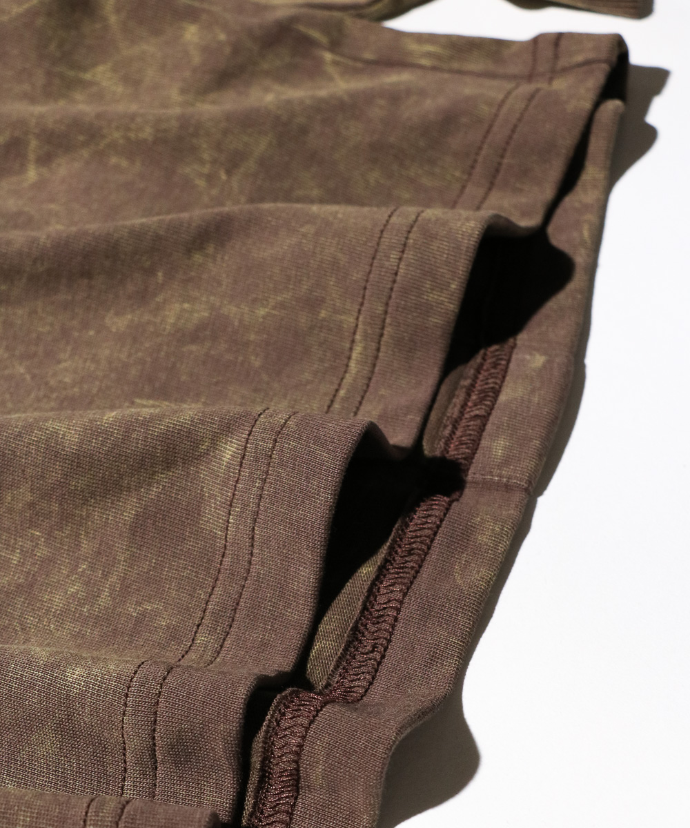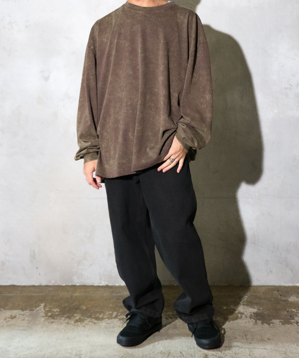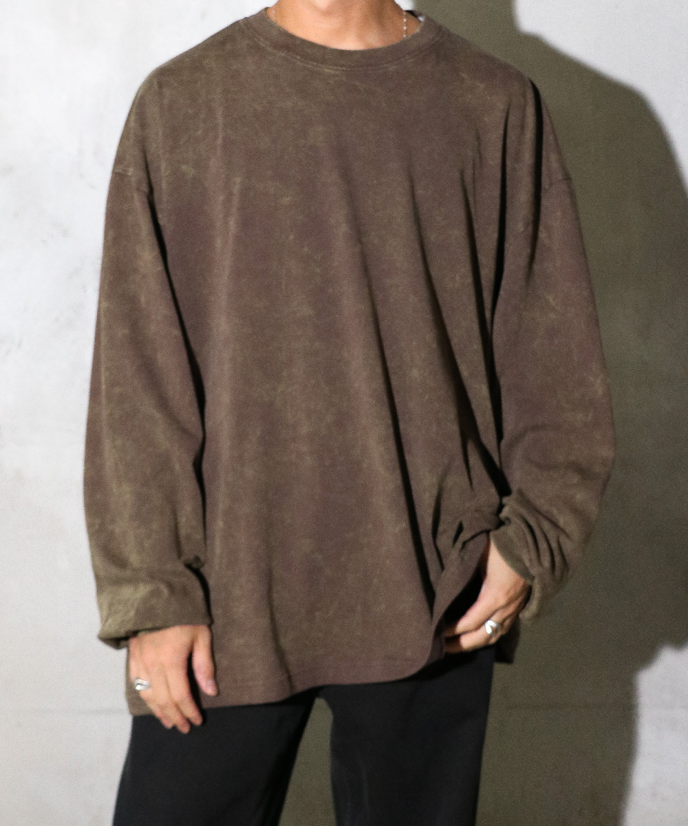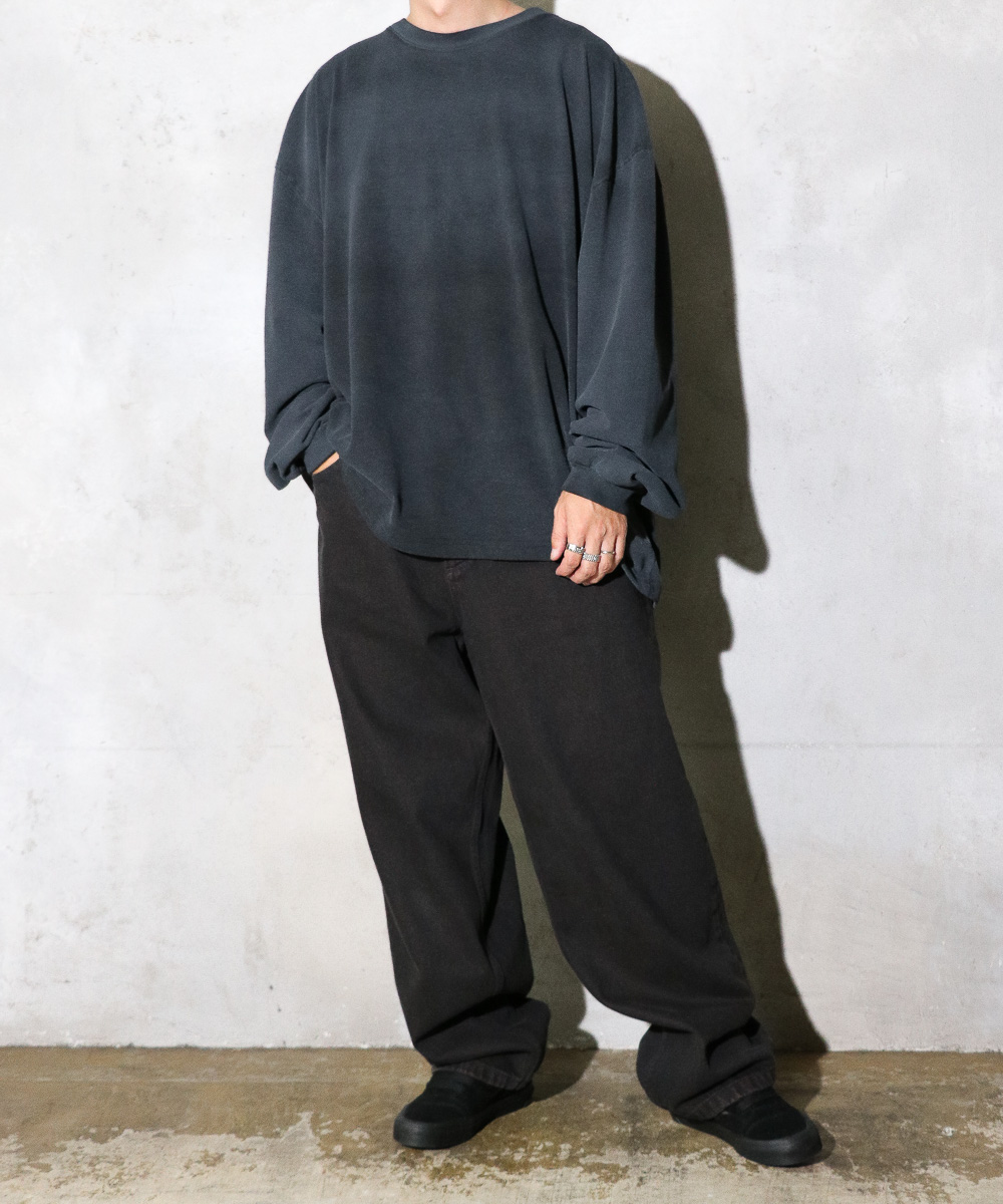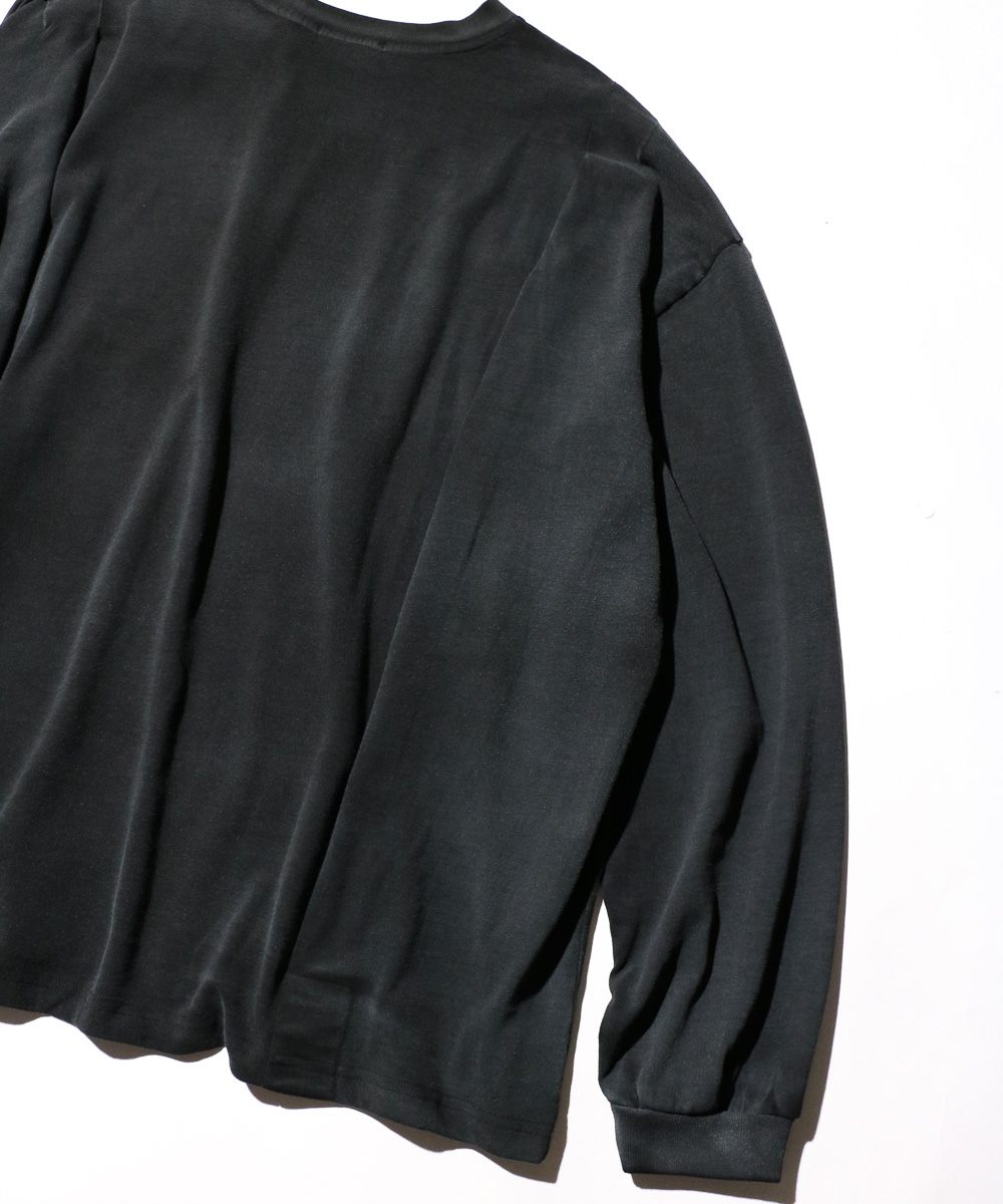 バックに入ったプリーツとゆったりめのシルエット、生地の程よいドレープ感相まってが雰囲気のあるLS Tシャツ。特殊な加工による独特な色合いのフェード感がシンプルでありながらも、スタイリングに奥行を与えてくれます。