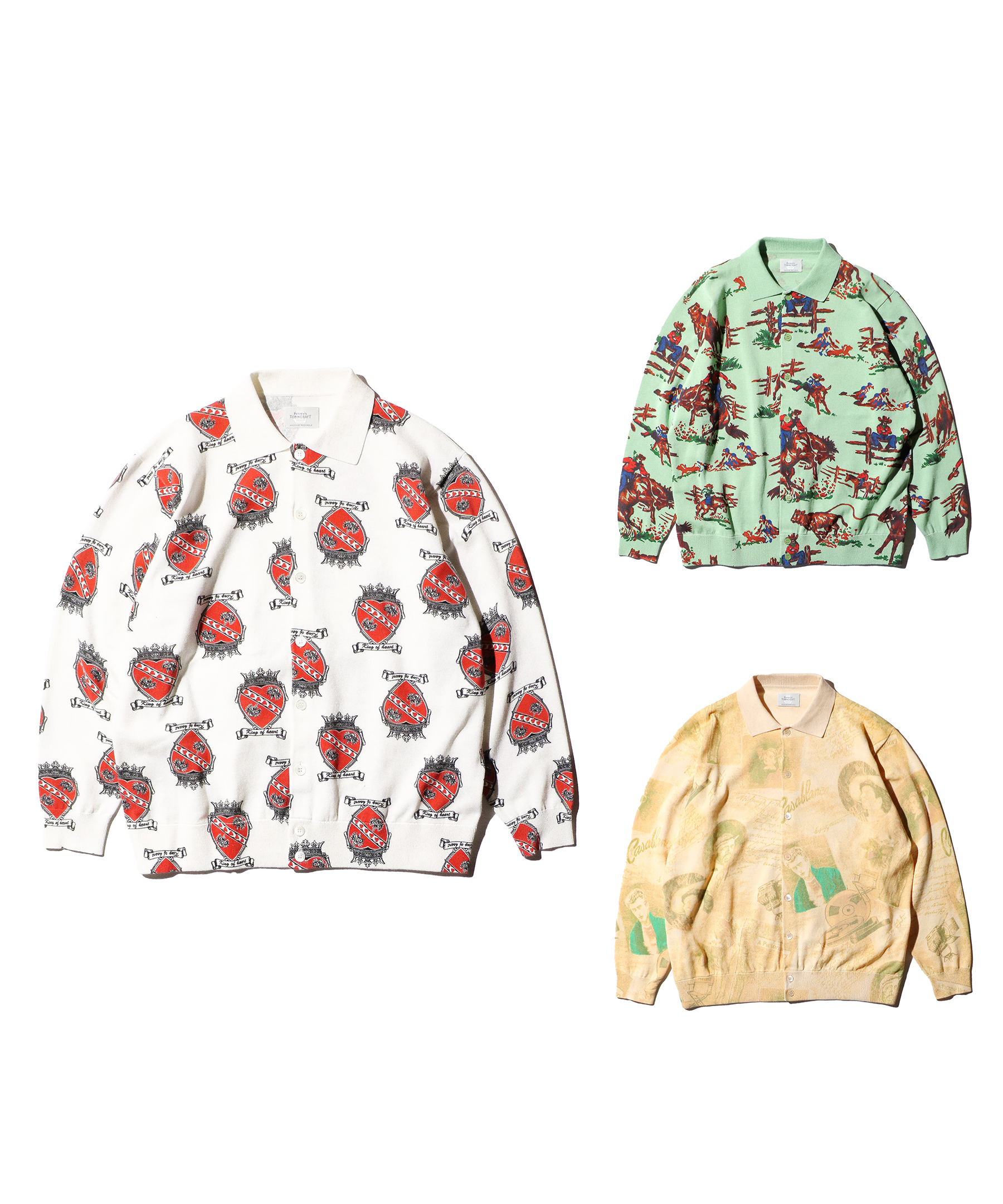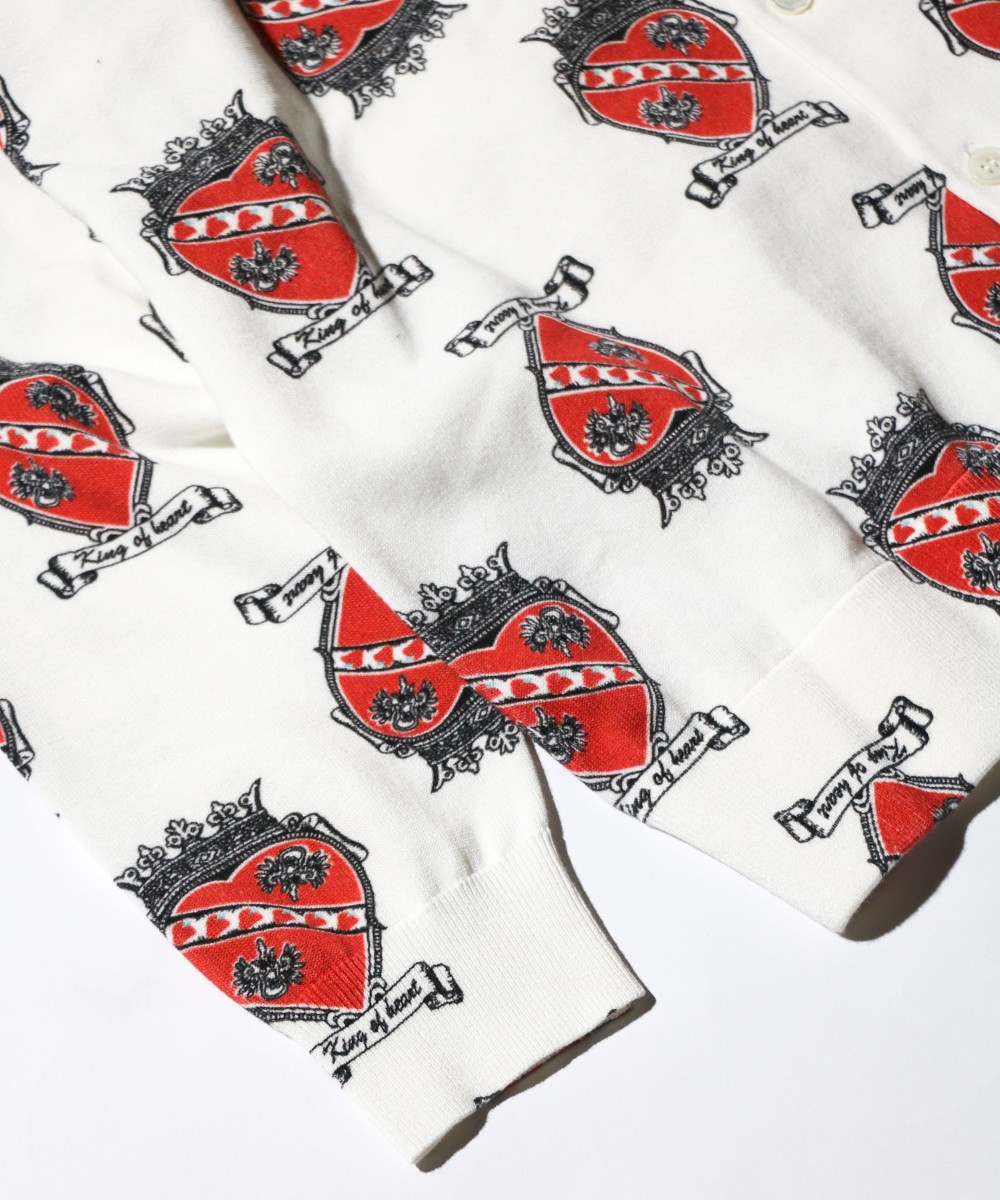 NICK&NORAのランチ・ハートクラウンの柄と90Sのアーカイブを再現したムービー柄を用いたポロカーディガン。