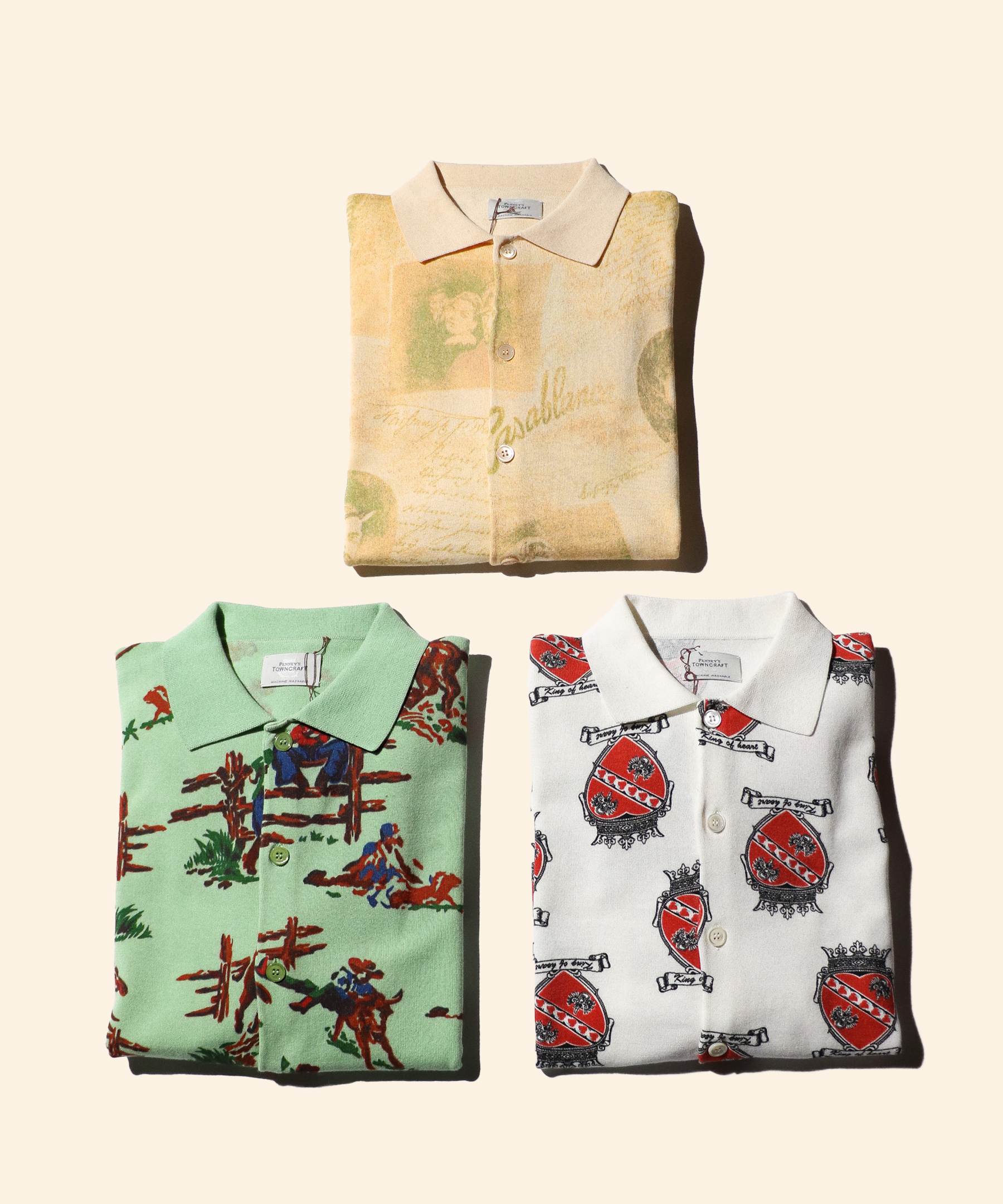 NICK&NORAのランチ・ハートクラウンの柄と90Sのアーカイブを再現したムービー柄を用いたポロカーディガン。