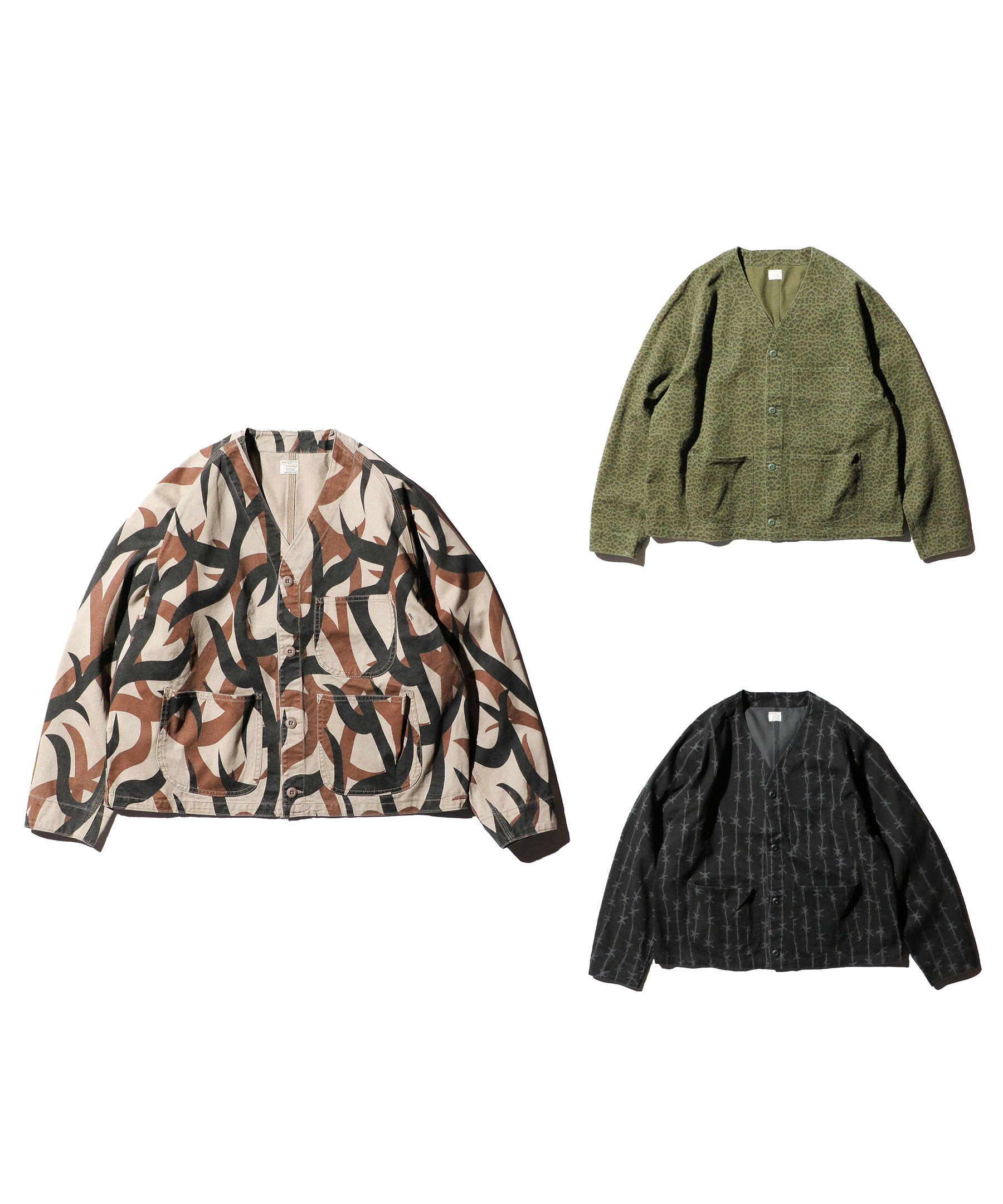 ・トライバルカモとレオパードとbarbed wire柄(有刺鉄線)。