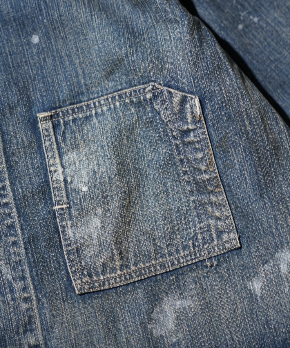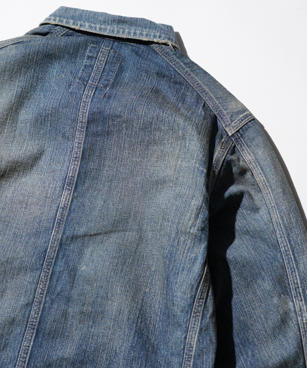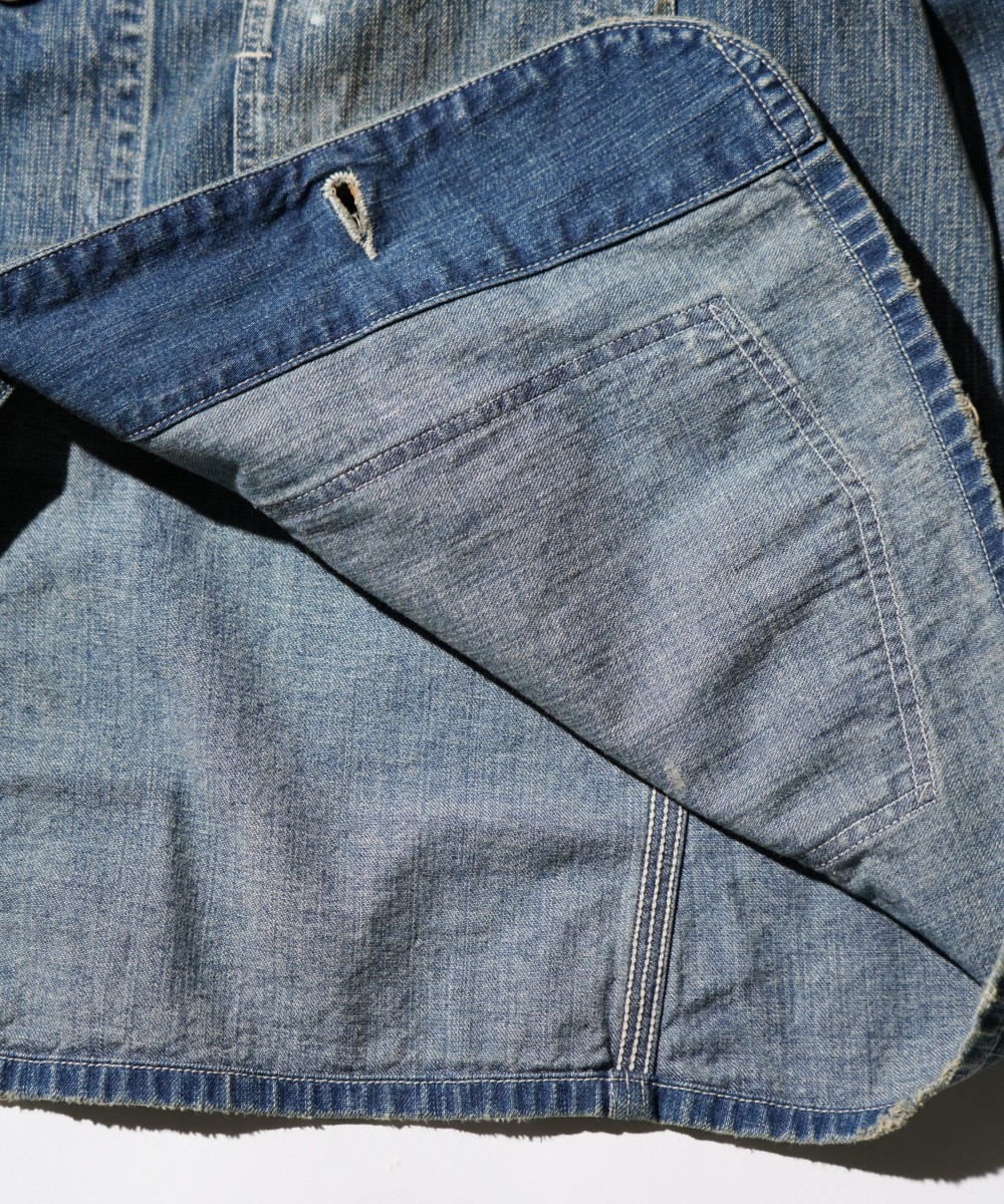 USカーハートのダブルニーパンツを解体し、カバーオールジャケットにアップサイクルした一着。