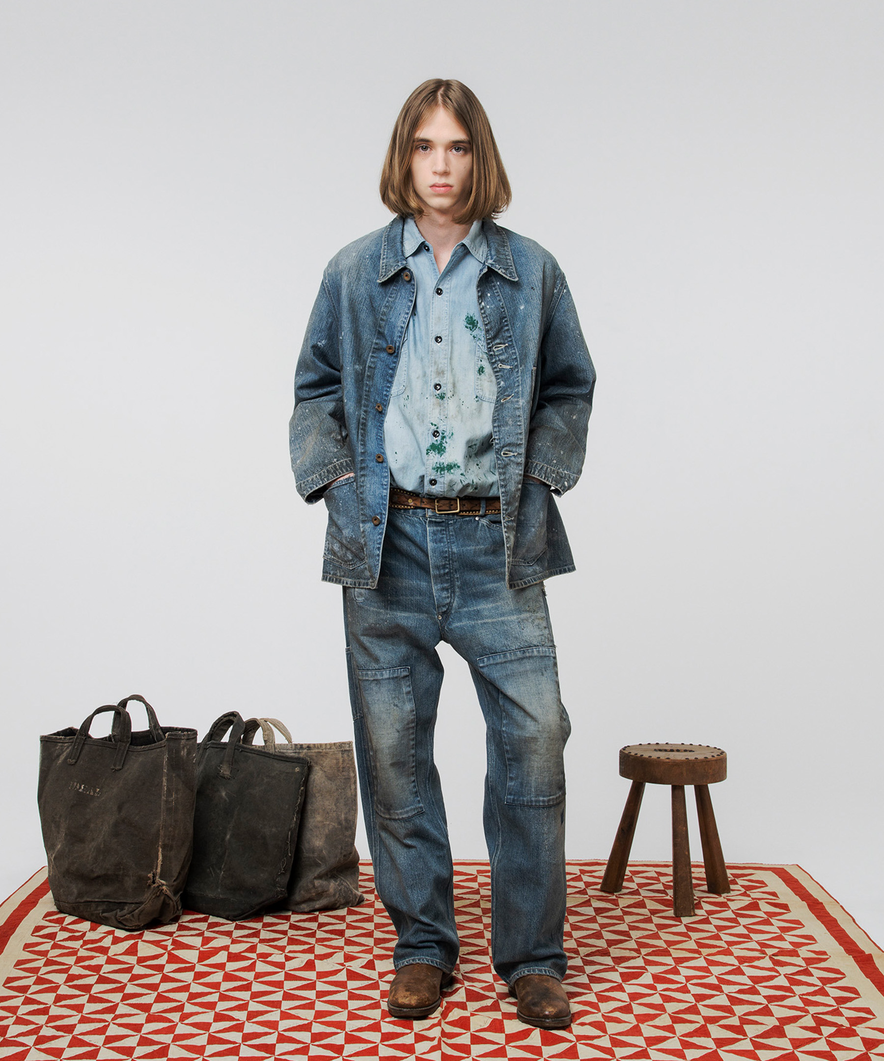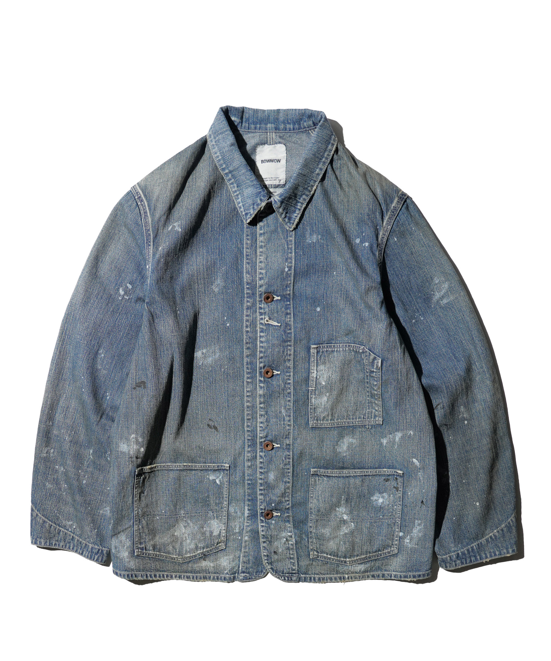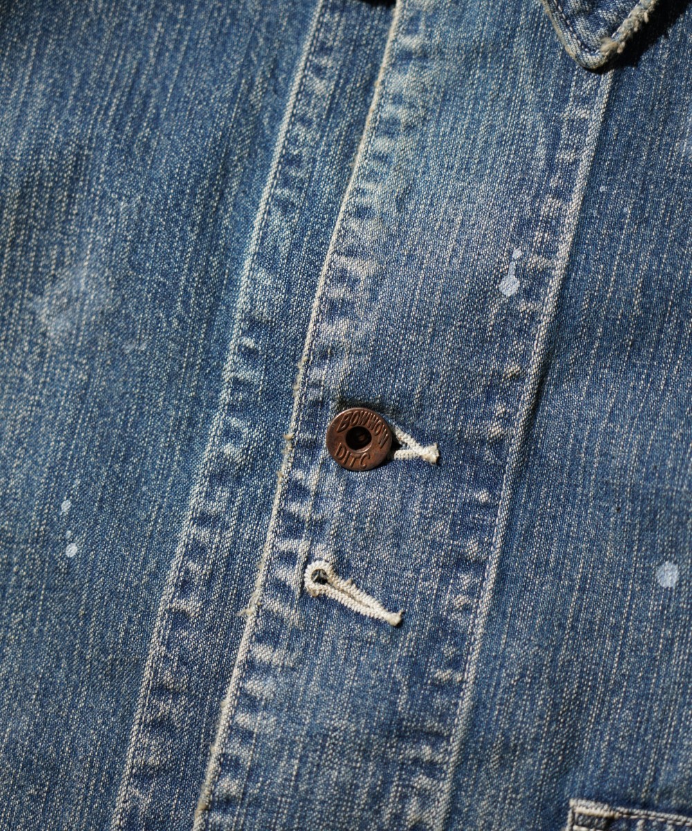 USカーハートのダブルニーパンツを解体し、カバーオールジャケットにアップサイクルした一着。