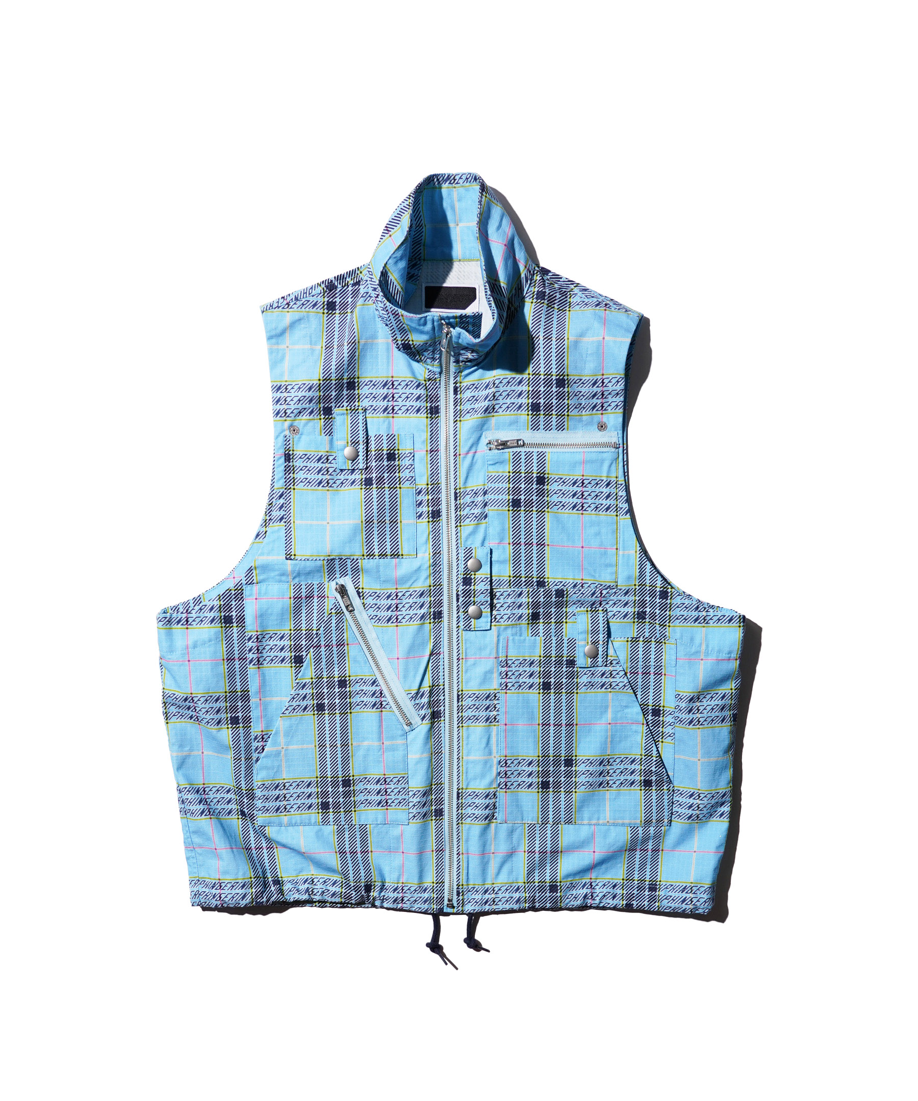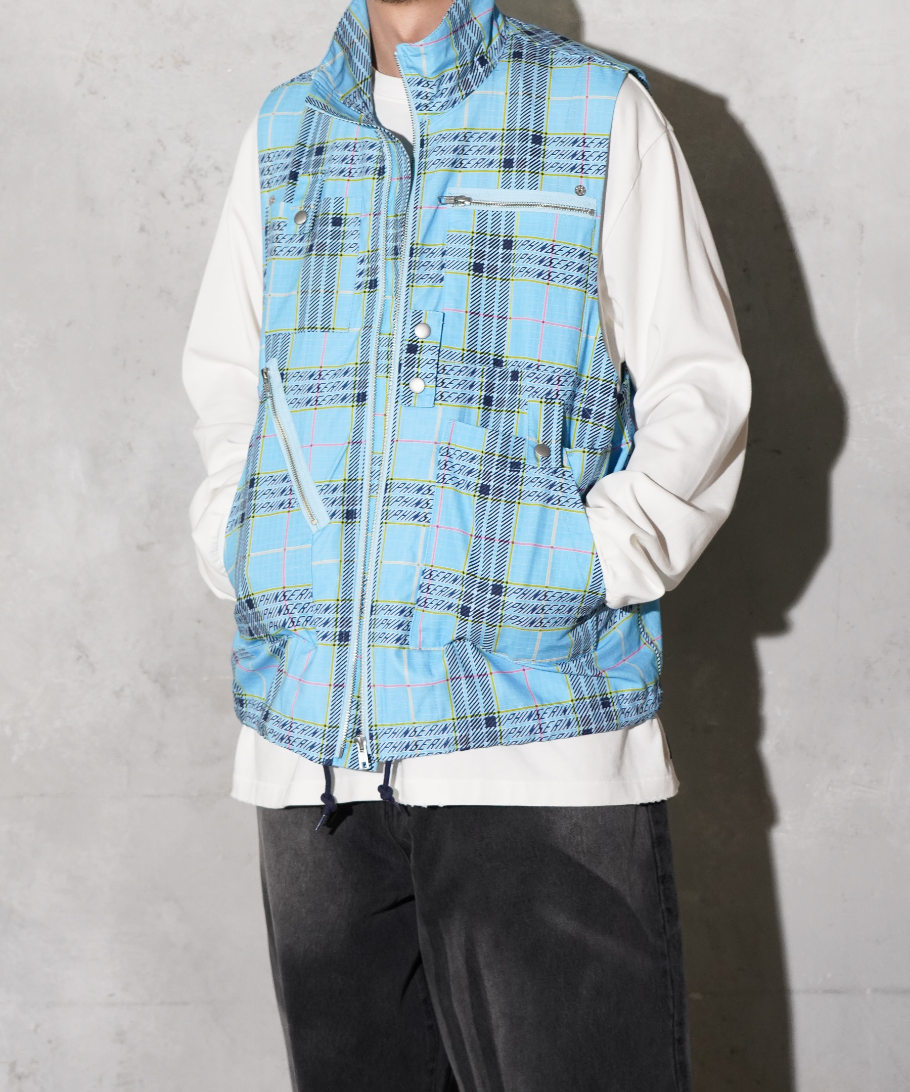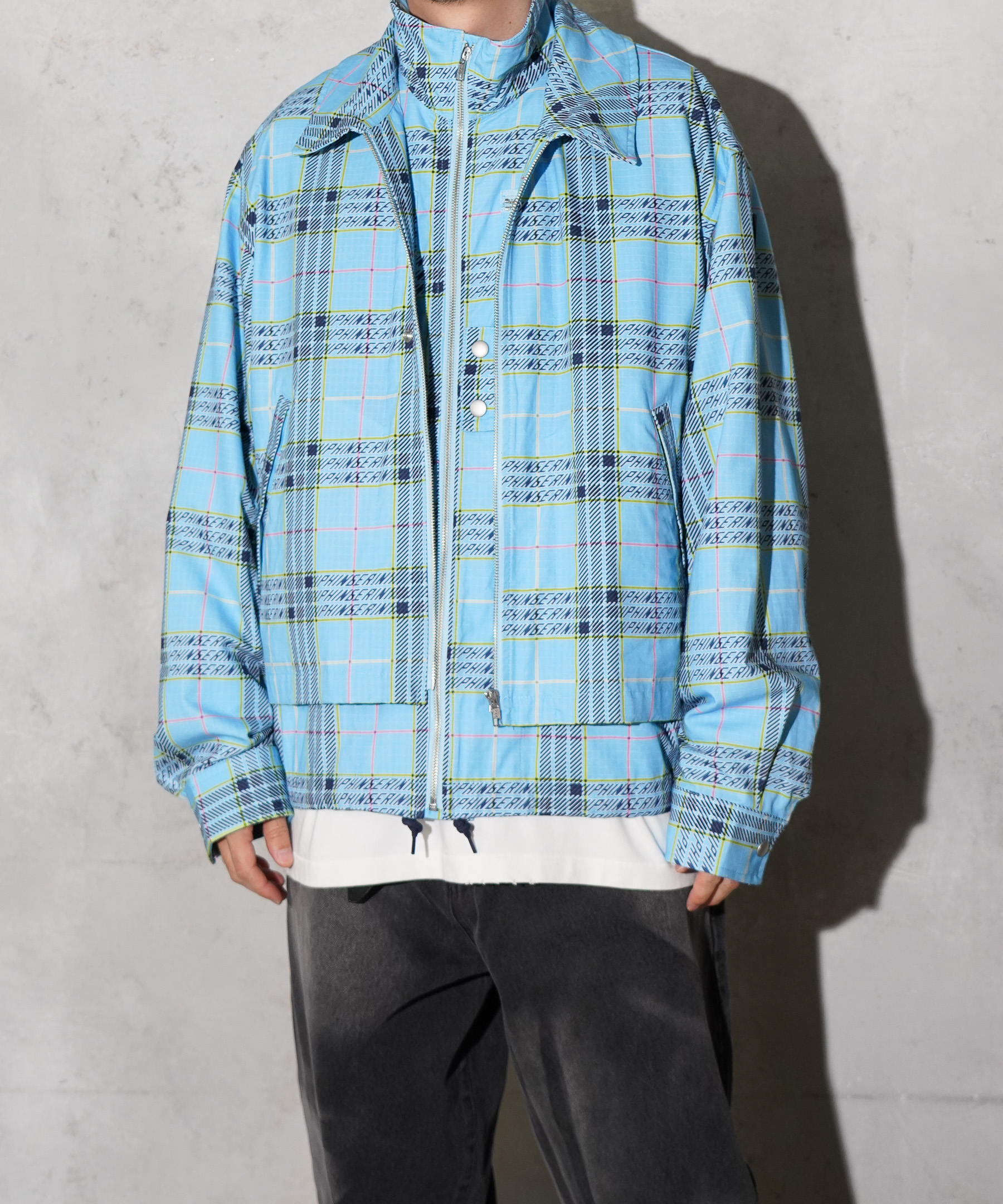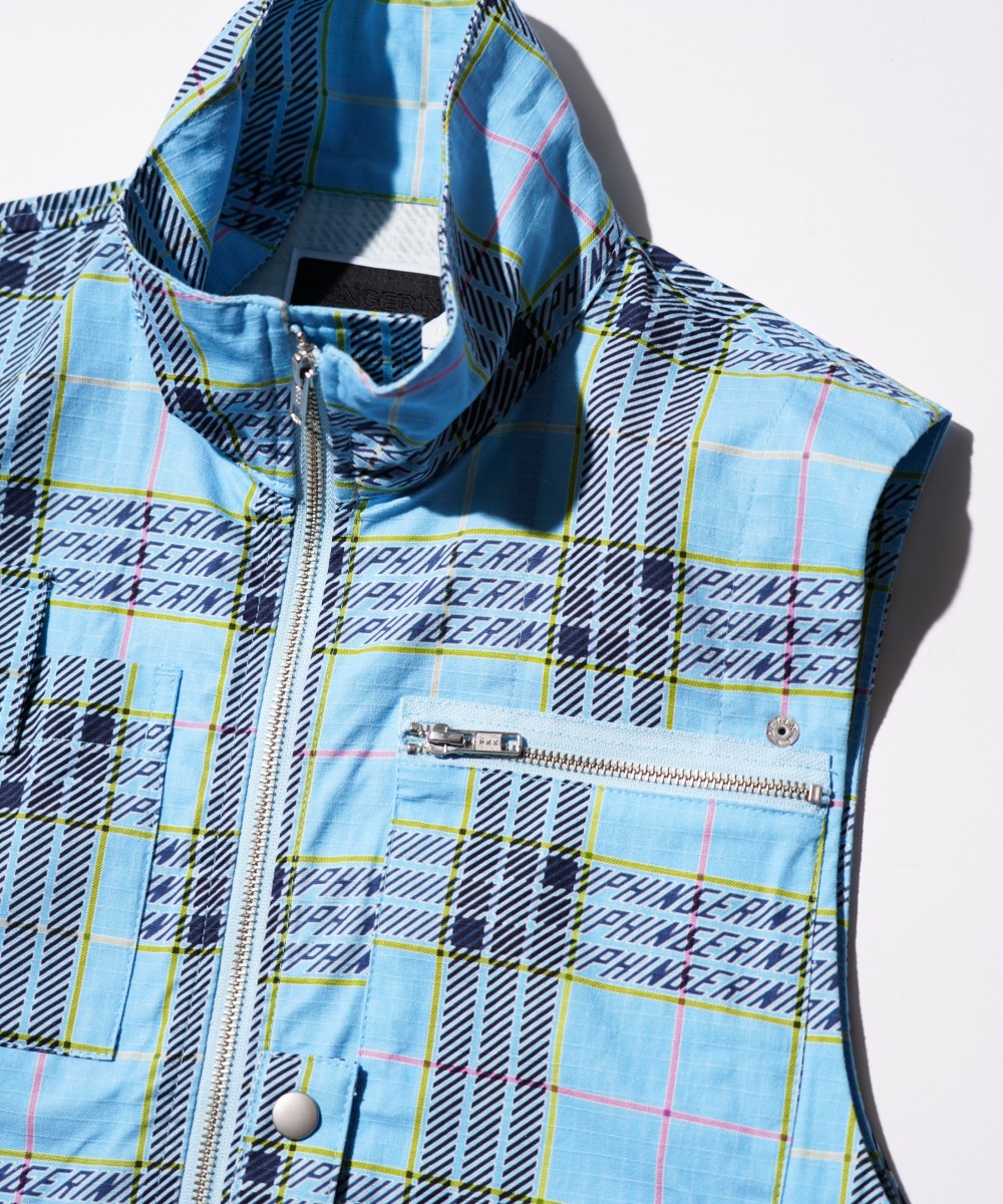 ミリタリーライクなコットンリップストップに、オリジナルプラッドプリント、PHINGERIN-PLAID柄をプリントした、ベスト+ショートコートがレイヤーとなったスタイルのオリジナルブルゾン。
