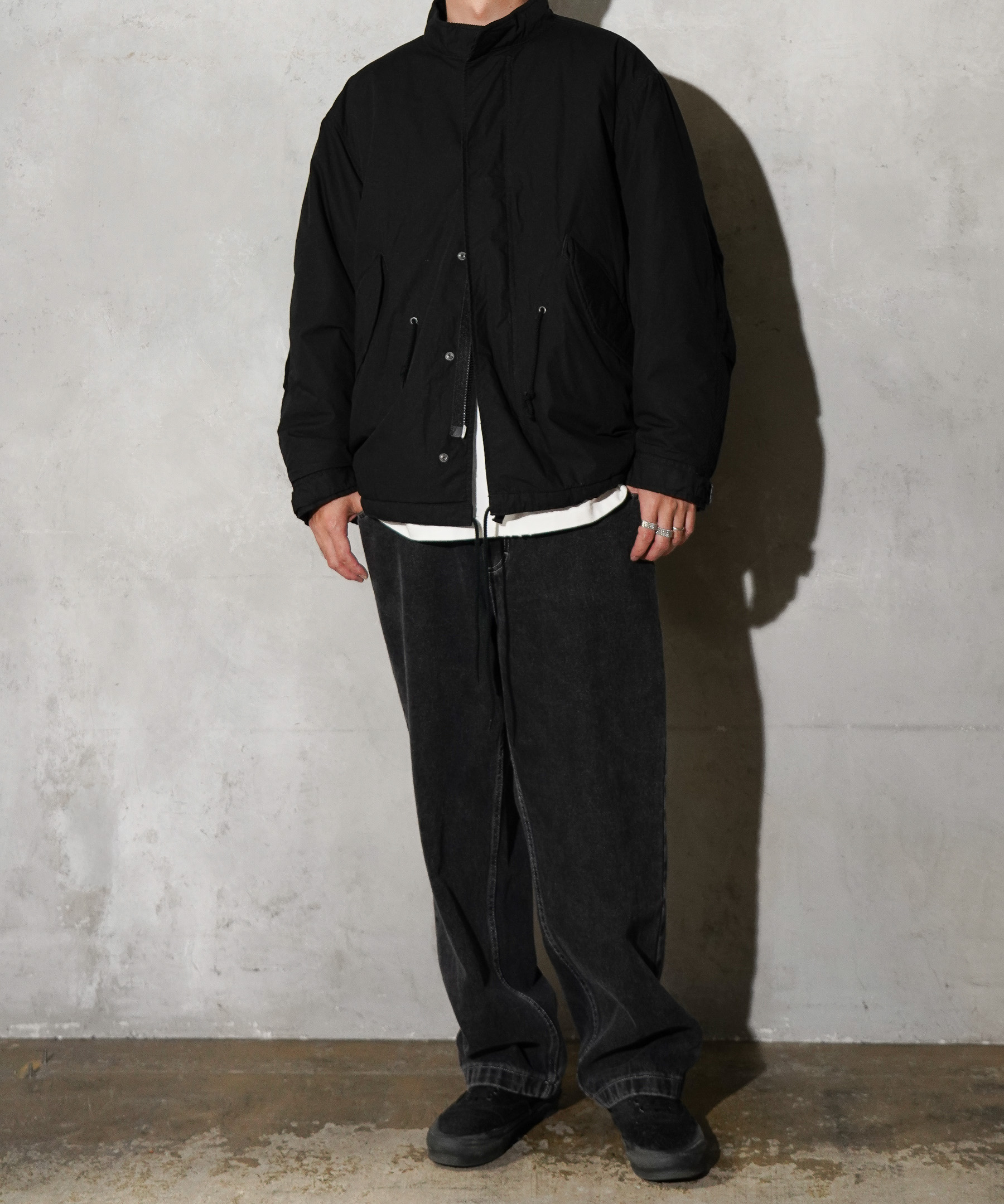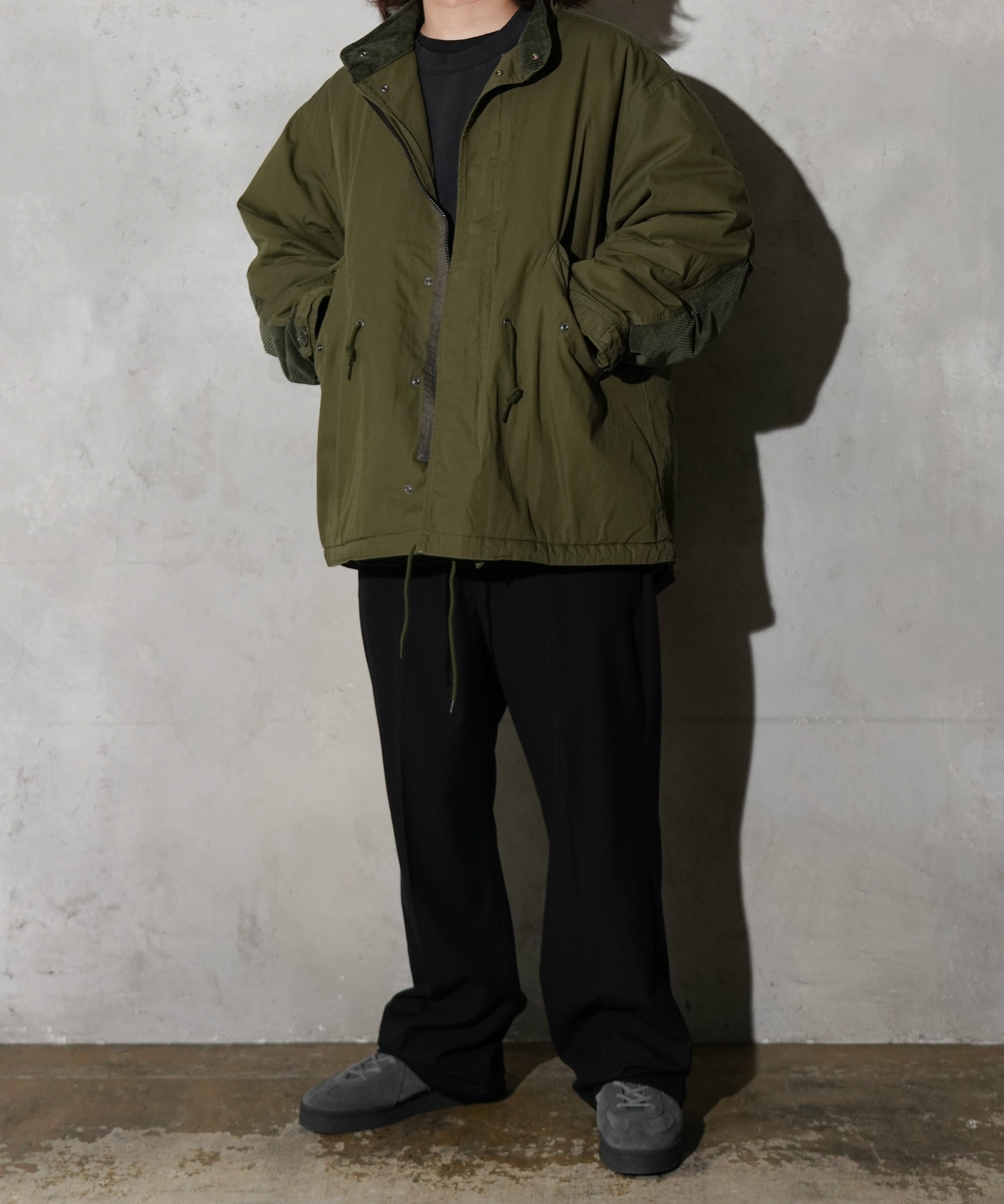 ミリタリー名作・M-65 フィッシュテールを、現代的に着やすいショート~ミドル丈へアレンジした一着。ゆったりとしたビッグシルエットで、インナーを選ばずデイリーに使える万能アウターです。経年変化を楽しめるコットンウェザーに、袖裏&襟裏のコーデュロイがさりげないアクセント。