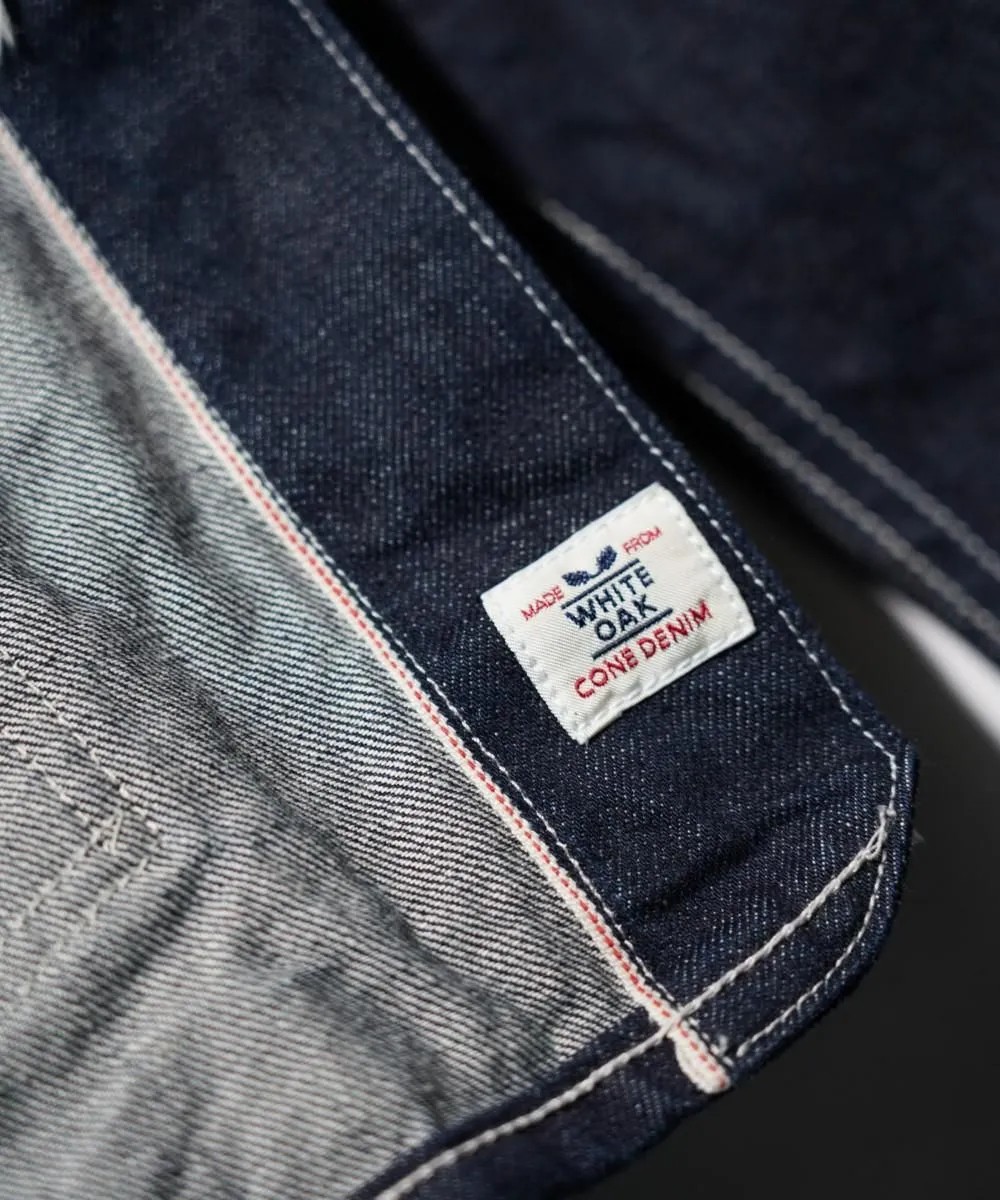 2017年に惜しまれつつ閉鎖された、米国ノースカロライナ州のコーンデニム社・ホワイトオーク工場でシャトル織機を用いて生産された稀少なデッドストック生地が使われており、その証としてWHITE OAK / CONE DENIMのタグも縫い付けられています。