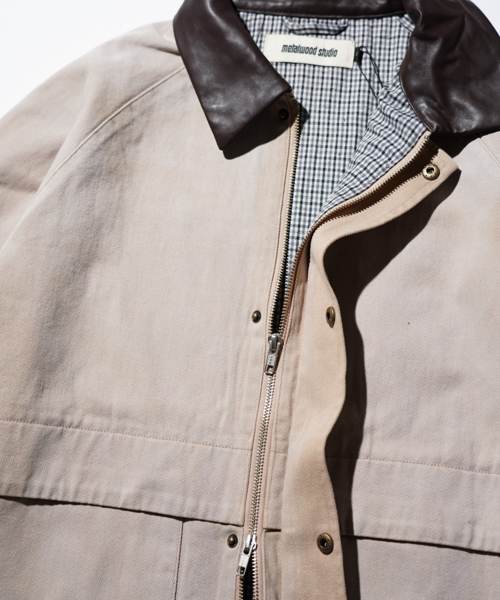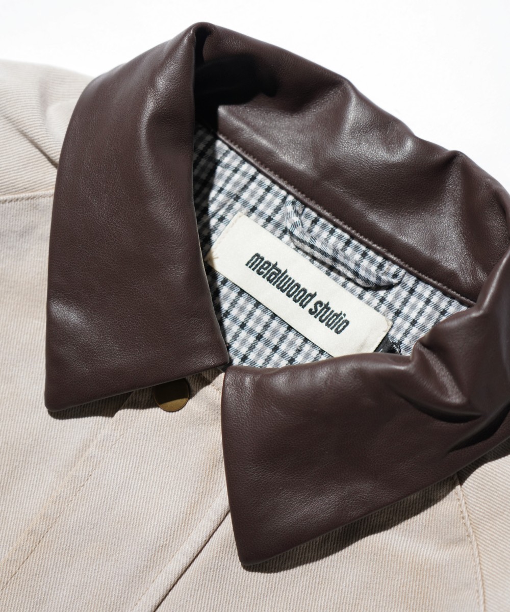 襟レザーの切り替えとヴィンテージウォッシュのボディが特徴的なカバーオール。