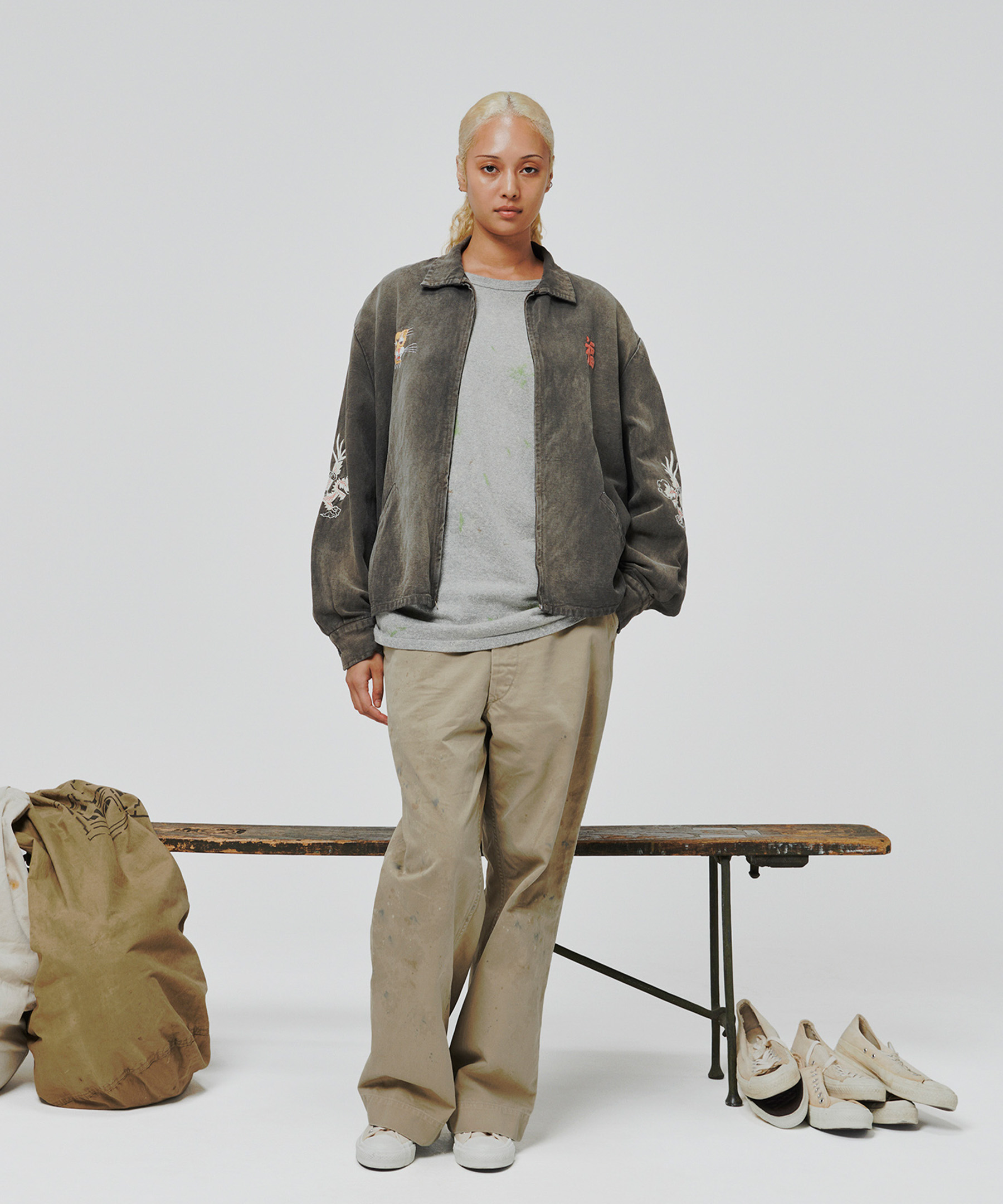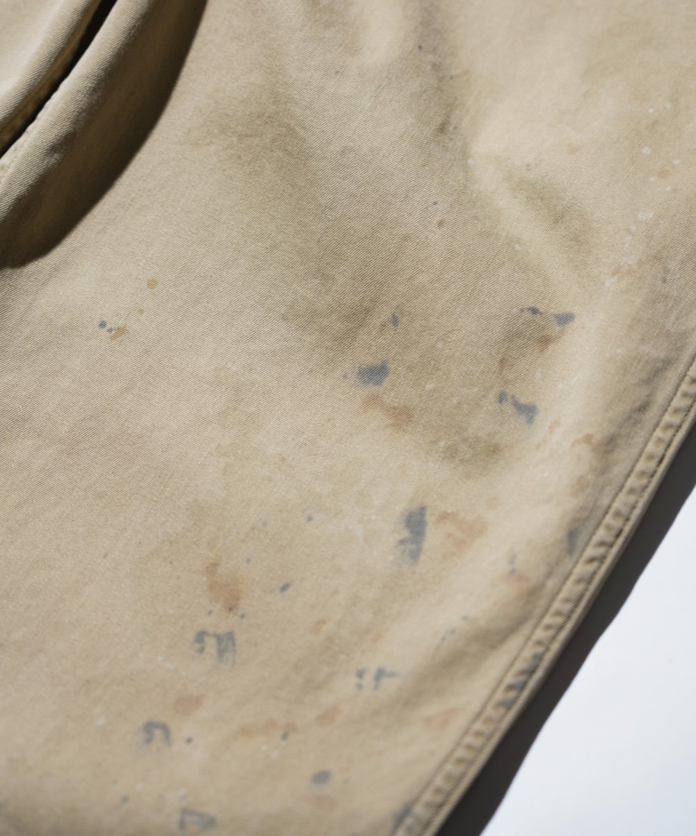 1941年モデルのKHAKI TROUSERSをベースに、BOW WOWで評価の高い水染みや汚れ染みの加工を施し、リアルな経年変化の空気感を加えている。