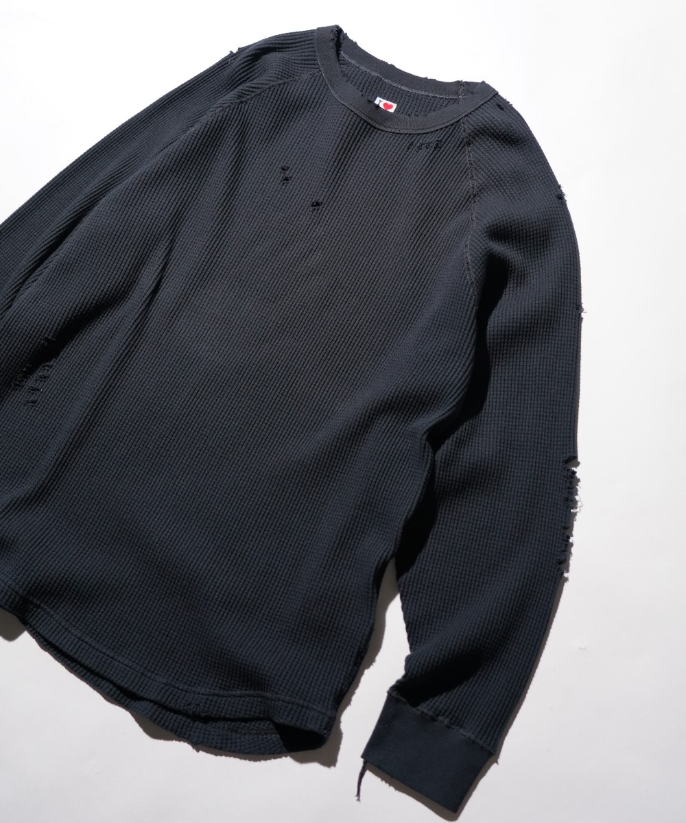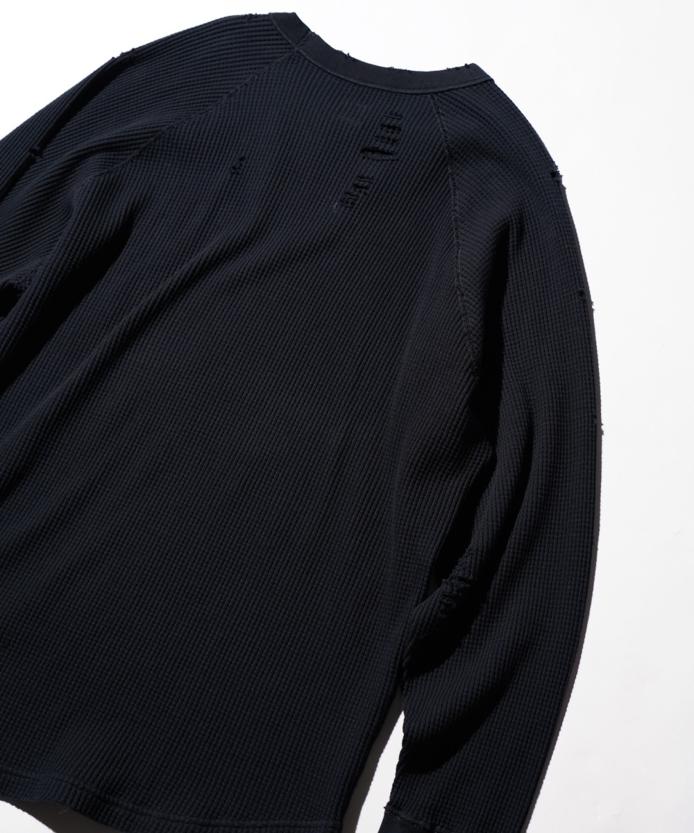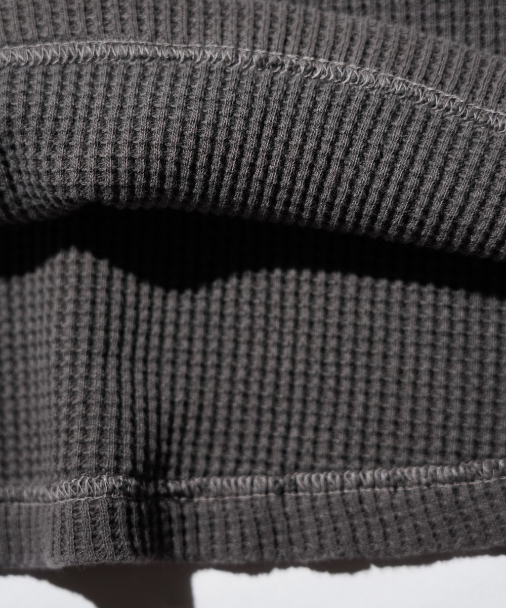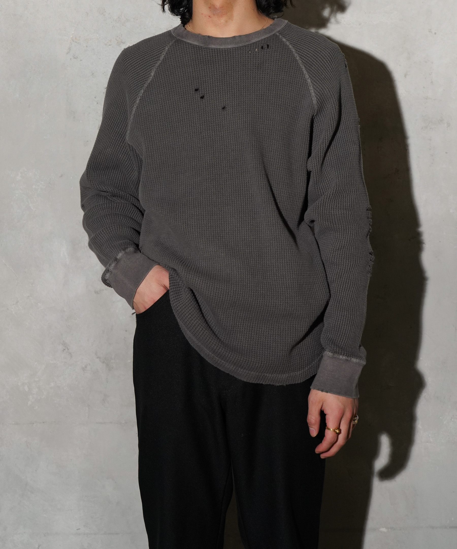 全体に施されたダメージ加工が程よく効いていて、無地ながらもしっかり存在感のある一着です。柔らかく肌なじみの良いワッフル生地は、見た目以上に軽くて着心地も抜群。シンプルなスタイリングの日ほど、さりげなく“こなれ感”をプラスしてくれるおすすめアイテムです。