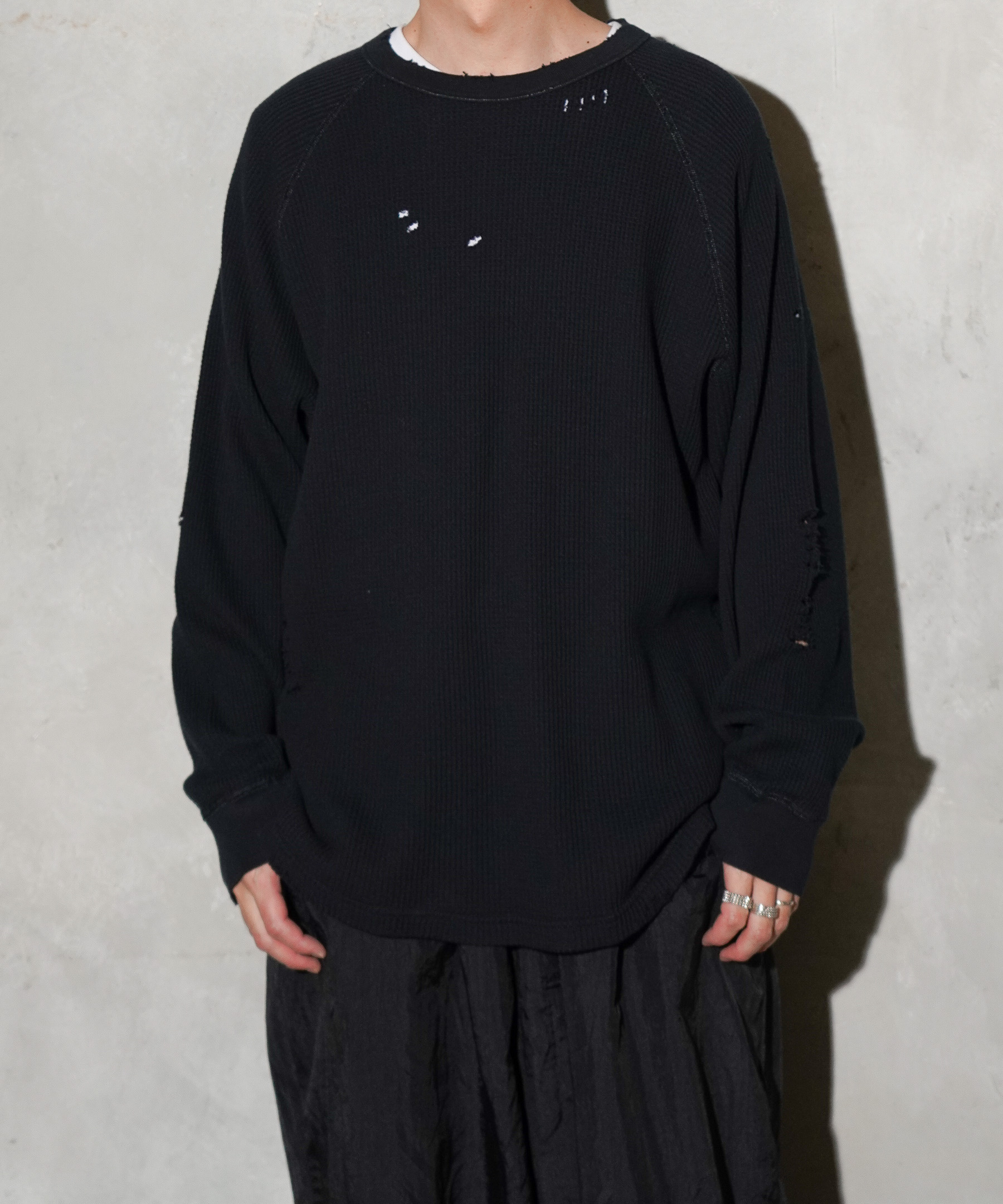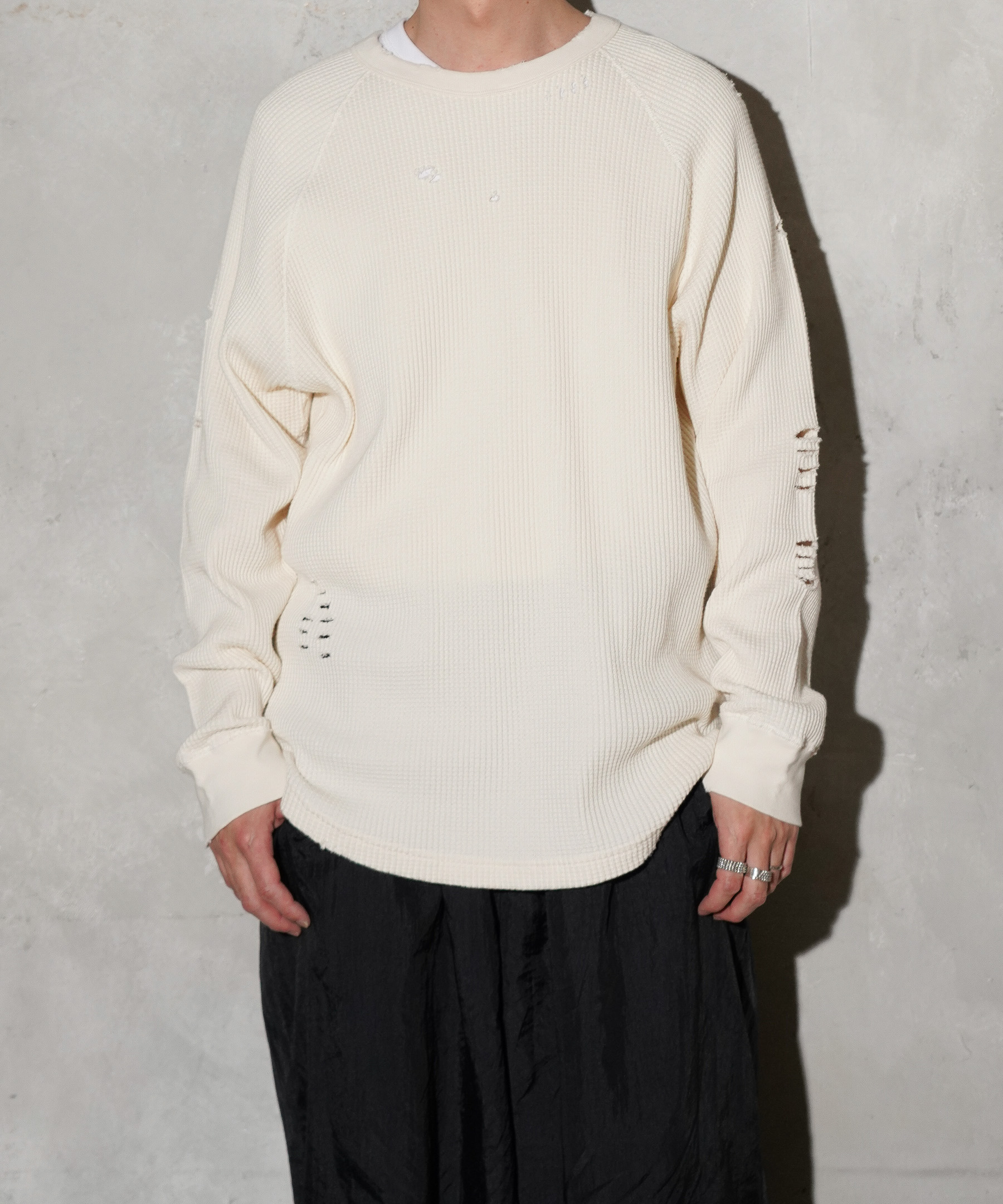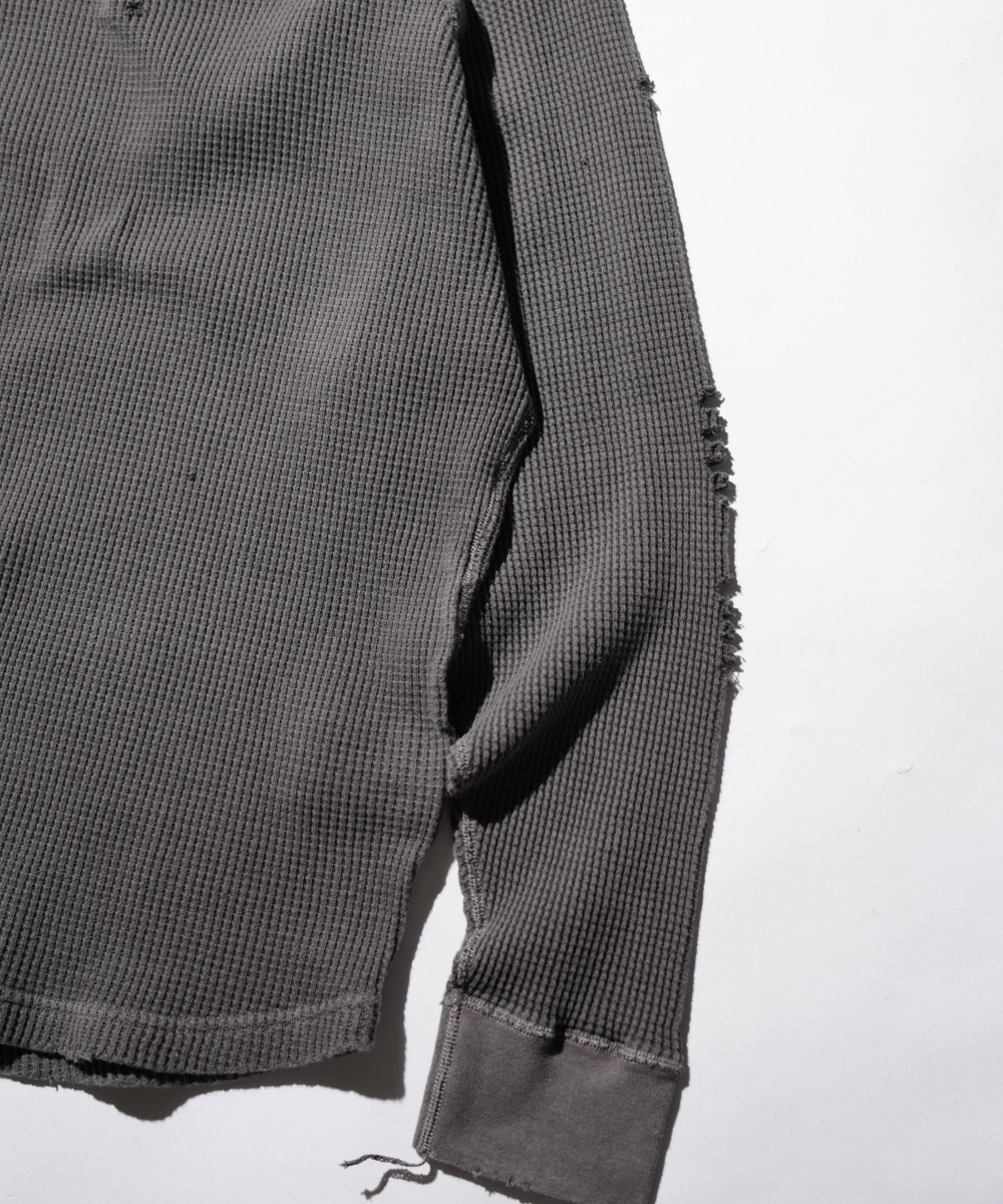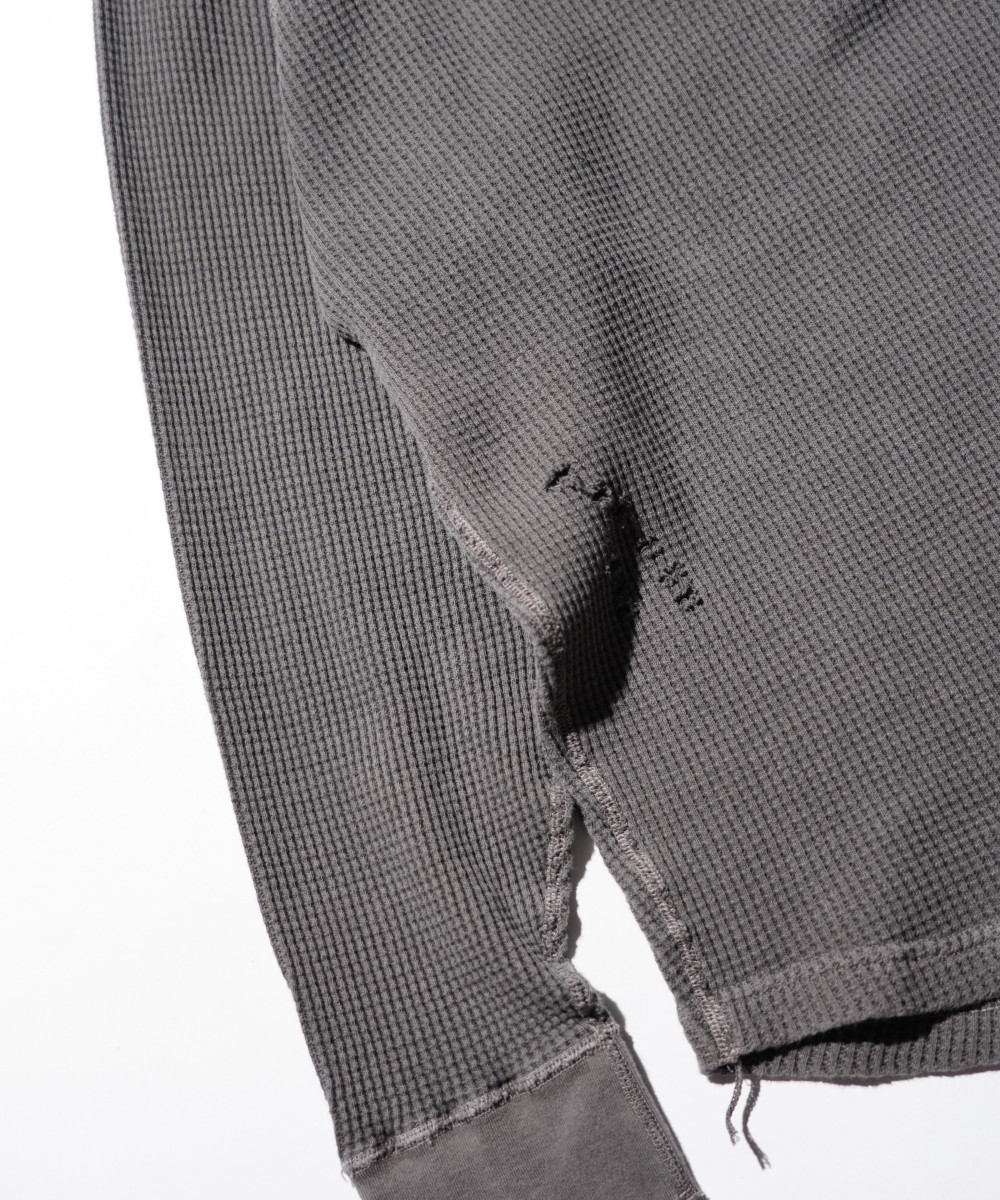 全体に施されたダメージ加工が程よく効いていて、無地ながらもしっかり存在感のある一着です。柔らかく肌なじみの良いワッフル生地は、見た目以上に軽くて着心地も抜群。シンプルなスタイリングの日ほど、さりげなく“こなれ感”をプラスしてくれるおすすめアイテムです。