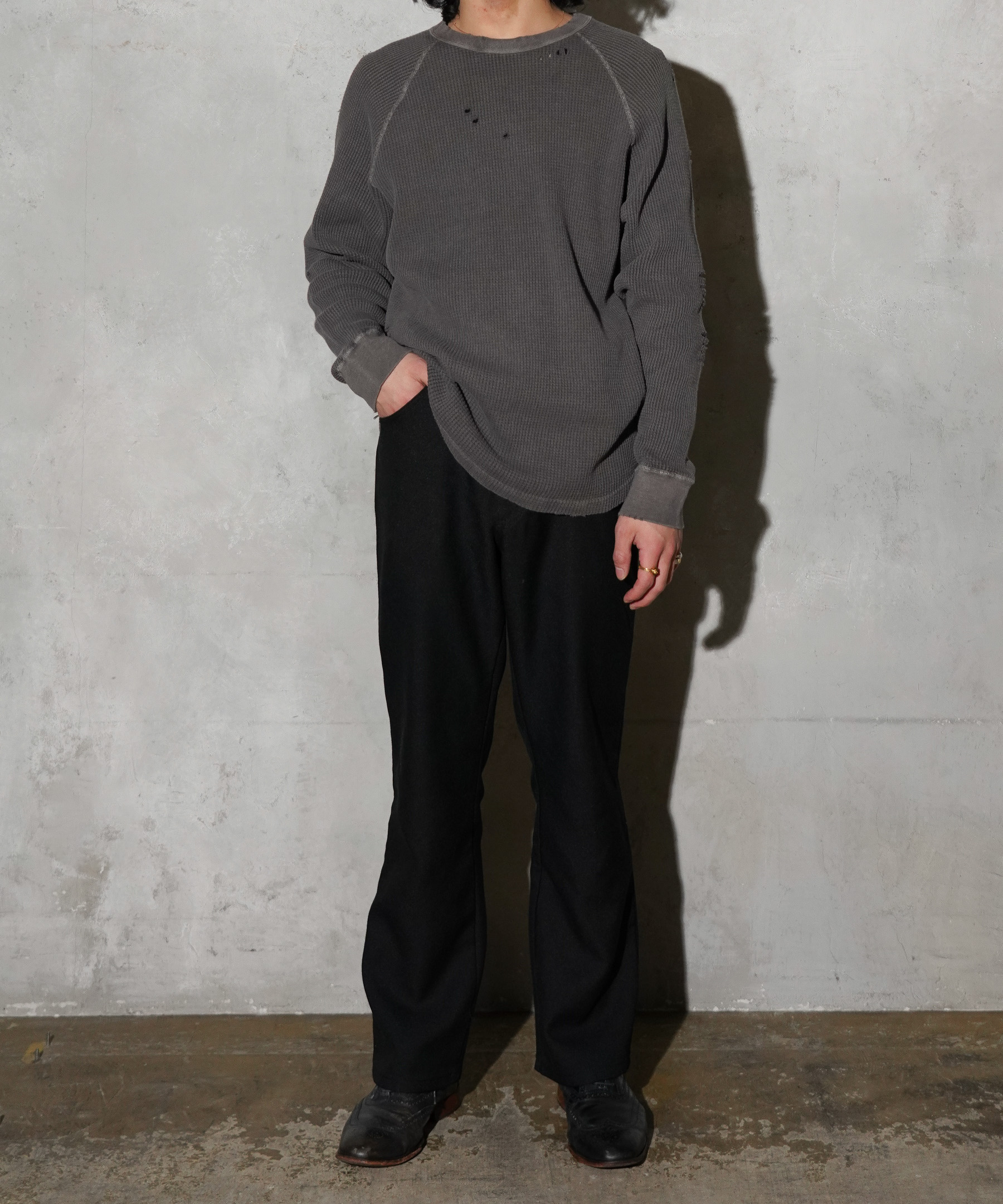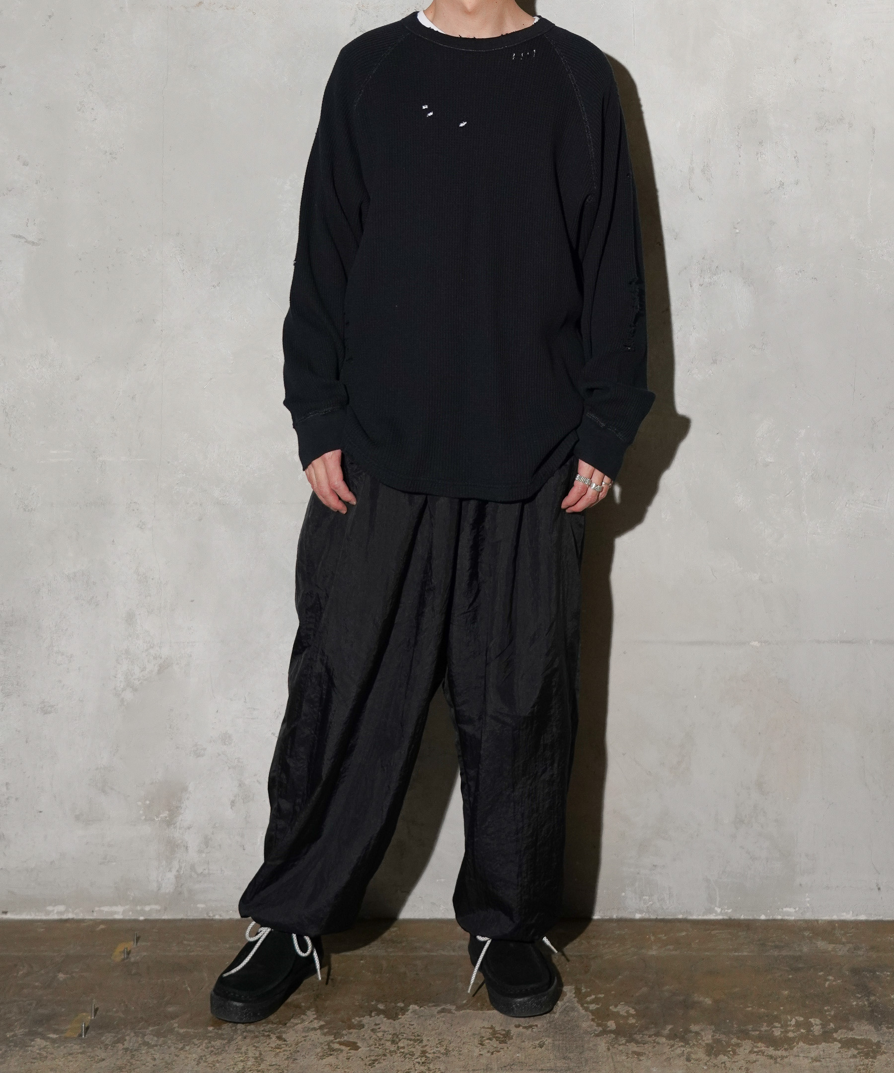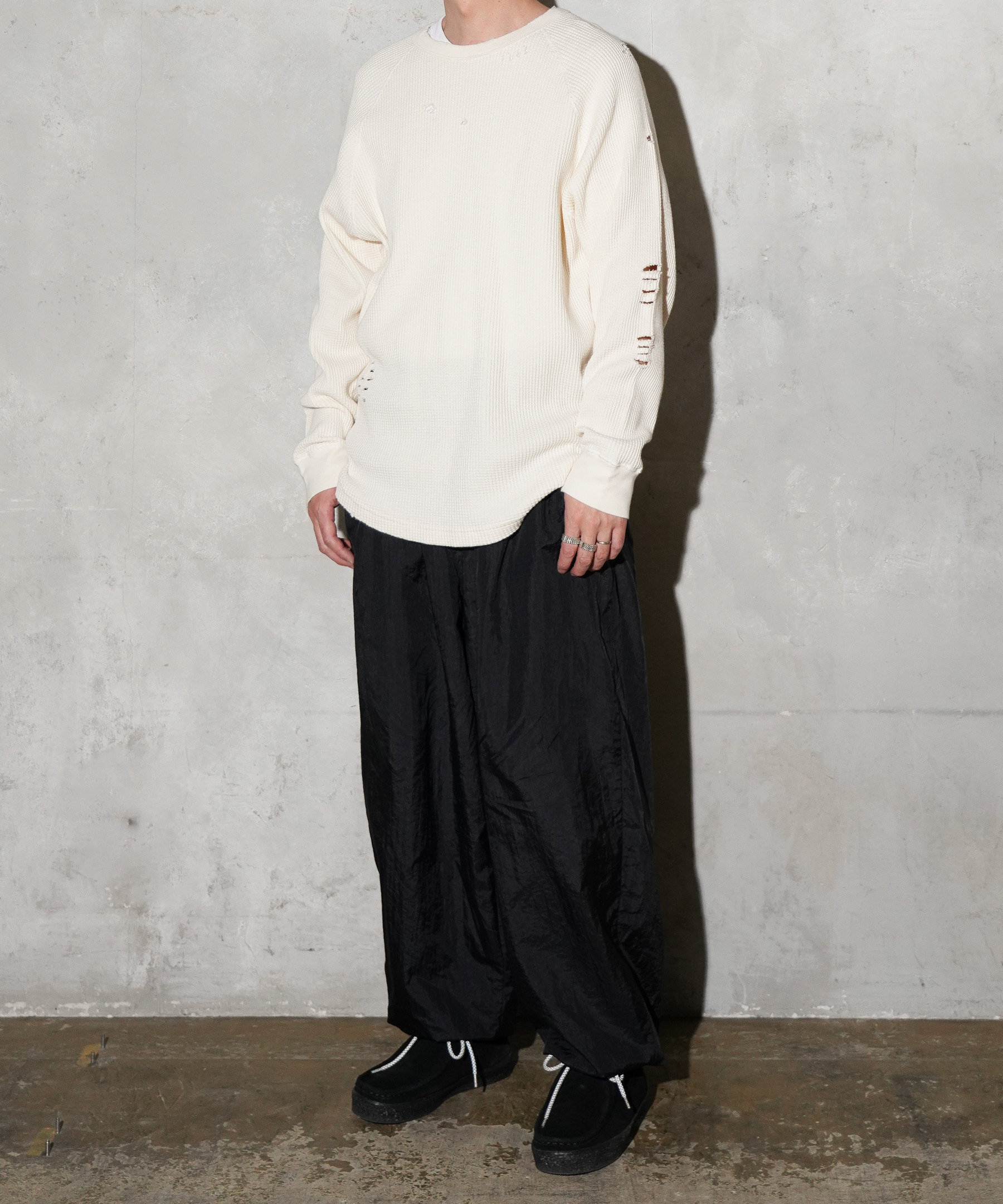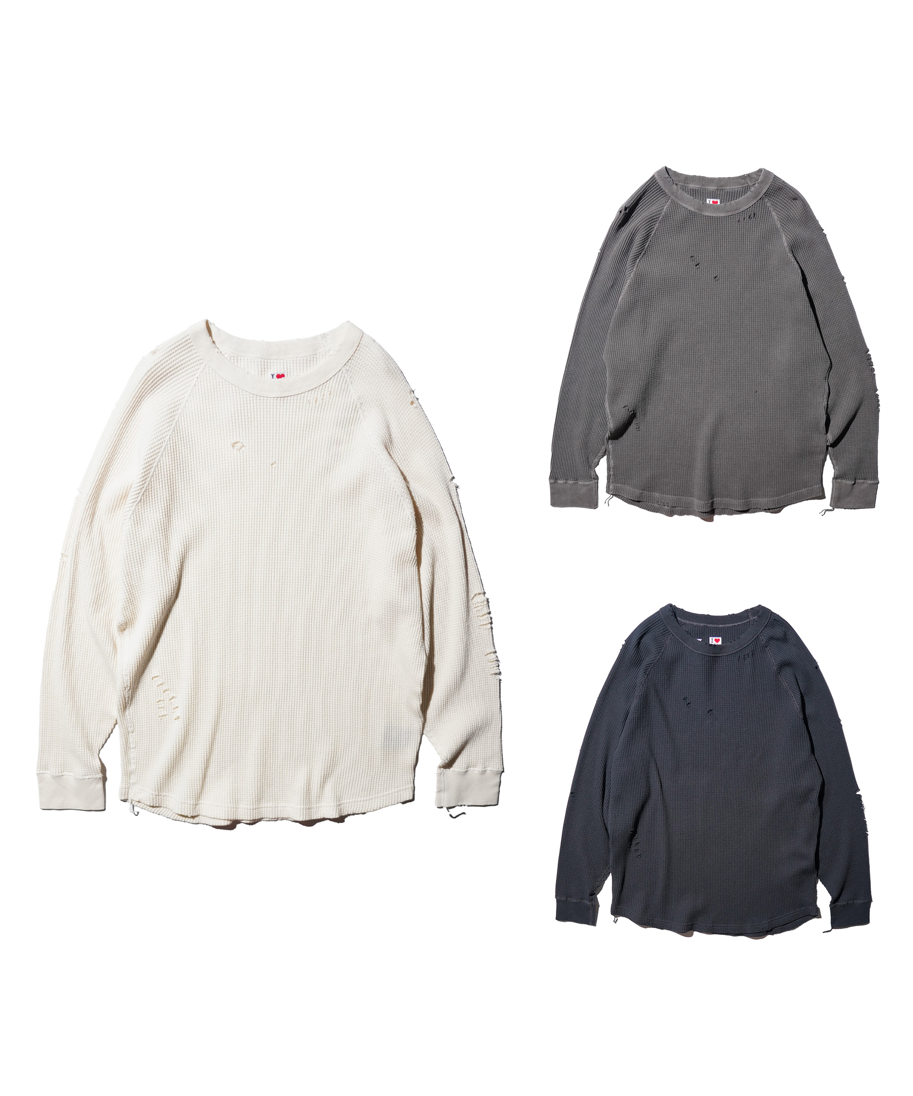 全体に施されたダメージ加工が程よく効いていて、無地ながらもしっかり存在感のある一着です。柔らかく肌なじみの良いワッフル生地は、見た目以上に軽くて着心地も抜群。シンプルなスタイリングの日ほど、さりげなく“こなれ感”をプラスしてくれるおすすめアイテムです。