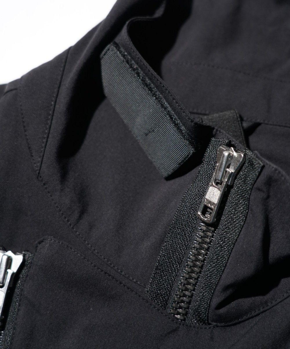 フロントの開閉次第でダブルライダース風にもスタンドカラーにも変化し、スタイリングにしっかり奥行きを出せます。生地はアメリカ製のミリタリーストレッチナイロン。軽量で伸縮性・撥水性・通気性を備え、見た目以上に快適です。