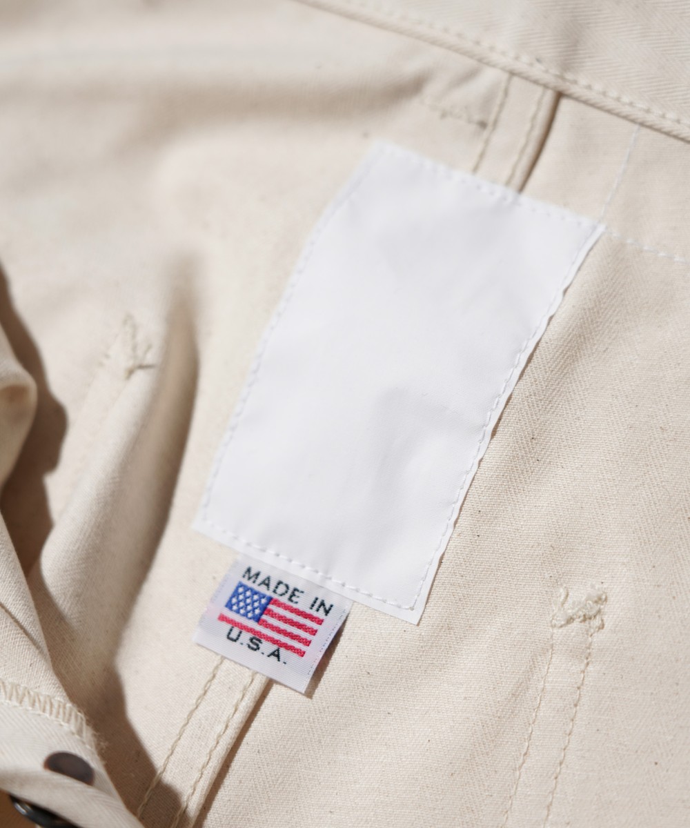 ・アメリカ・Carr Textile社製は1973年にミズーリ州で創業し、ユニフォームやワークウェア向けの実用生地を供給してきたテキスタイルサプライヤーで、耐久性に優れた素材を強みとし、現在もアメリカ製を中心に幅広い分野へ生地供給を続けています。 ・ボタンには金属製の月桂樹ドーナツボタンを採用