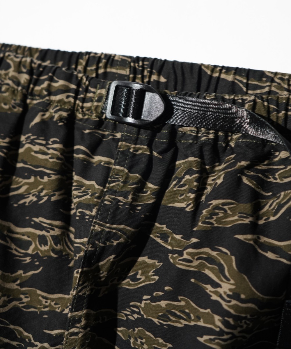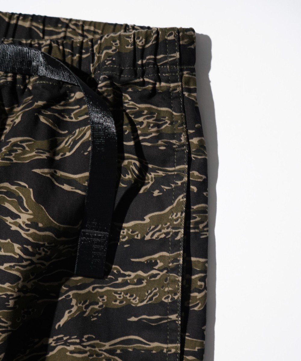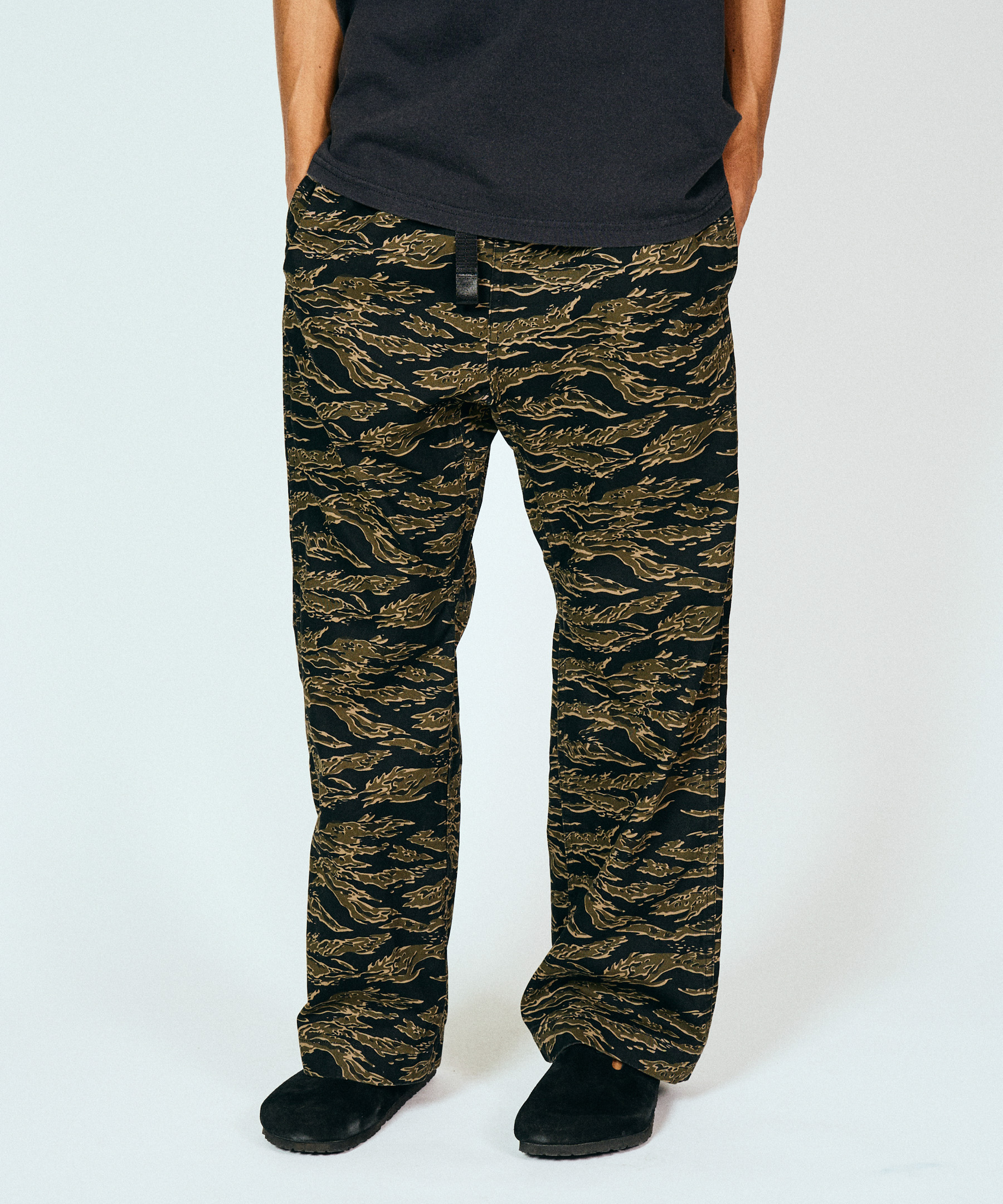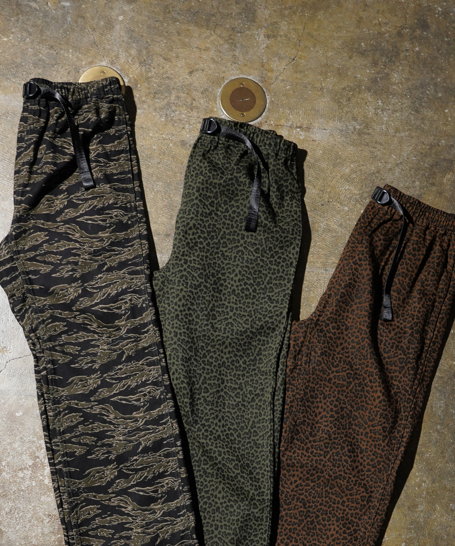 90年代アウトドアのクライミングパンツをベースに、現代的にアップデートされた一本。アースカラーのレオパードやタイガーカモはインパクトがありながらも、スタイリングに自然と馴染む絶妙なバランスです。