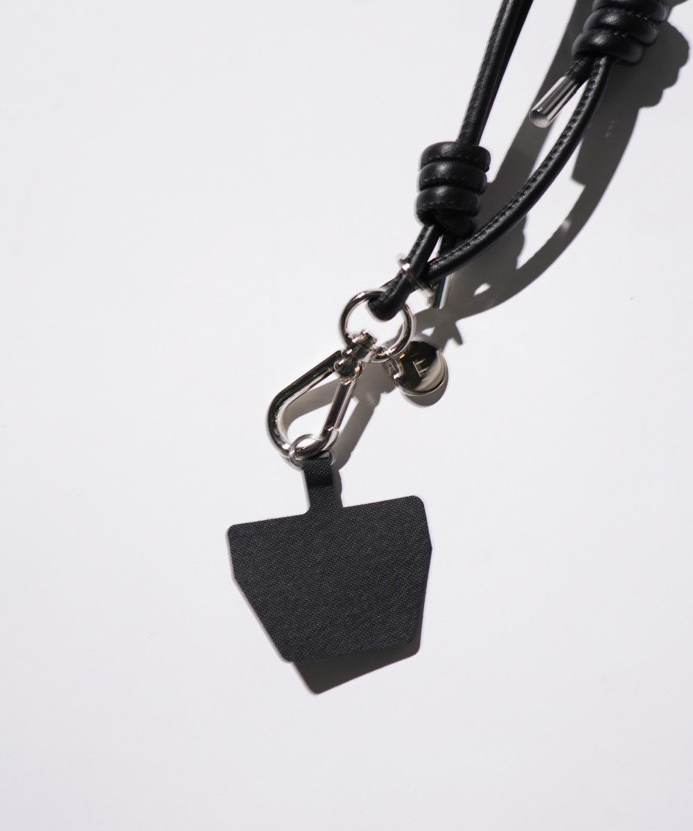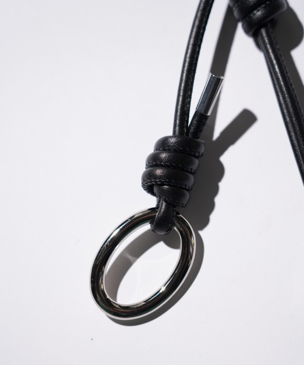 楕円形のメタルパーツがアクセントになった、ミニマルなレザーコードチャーム。