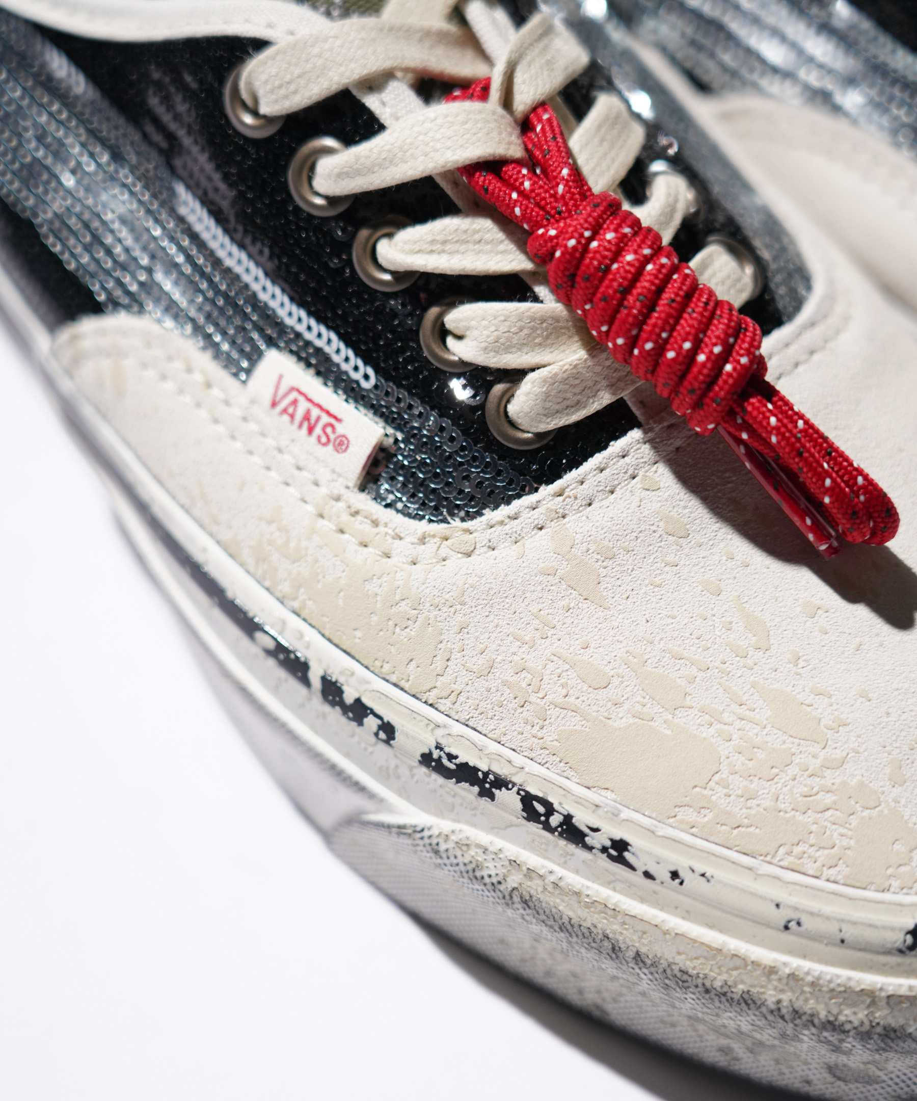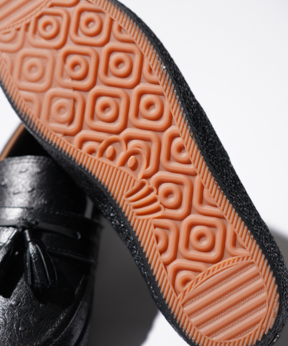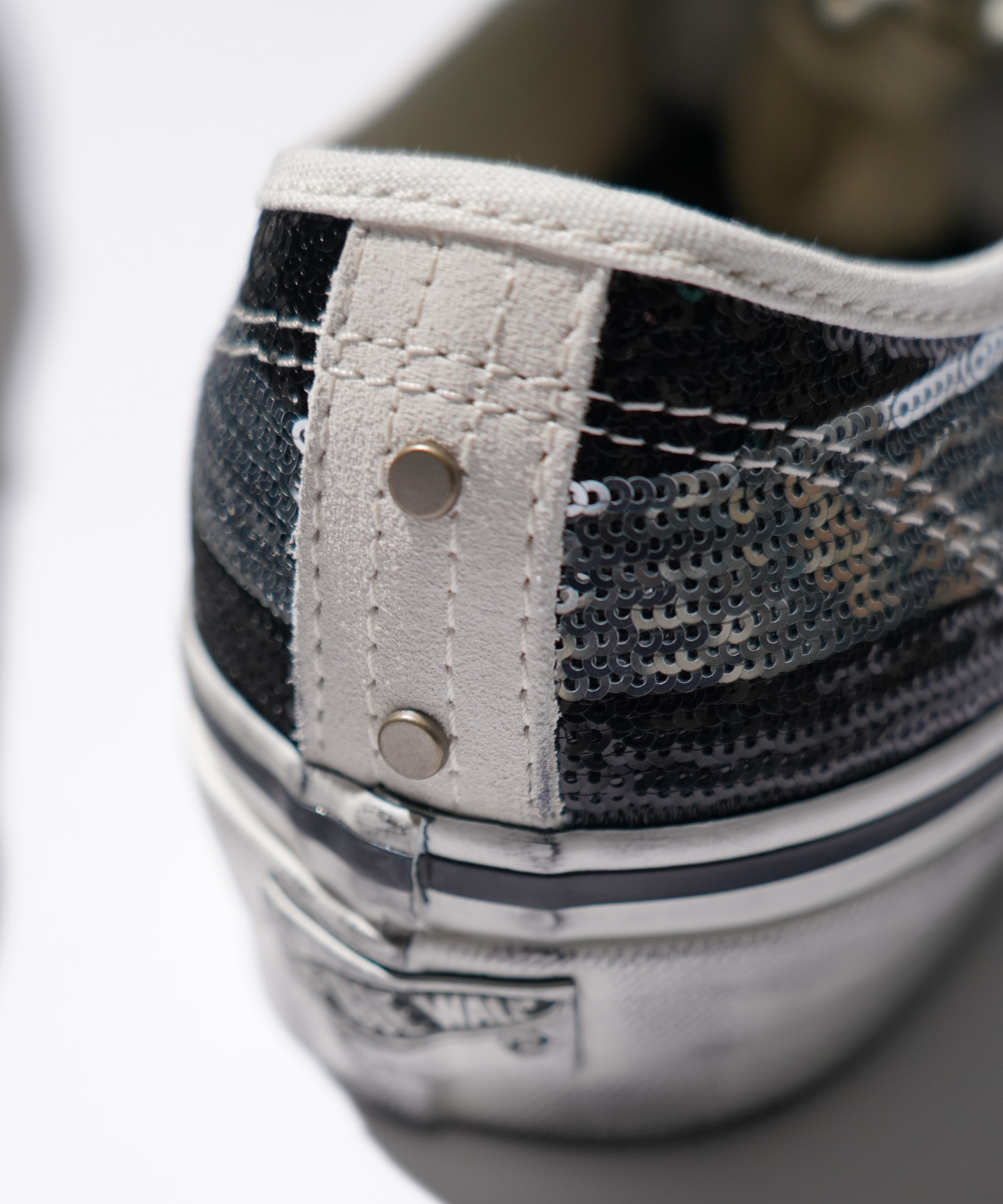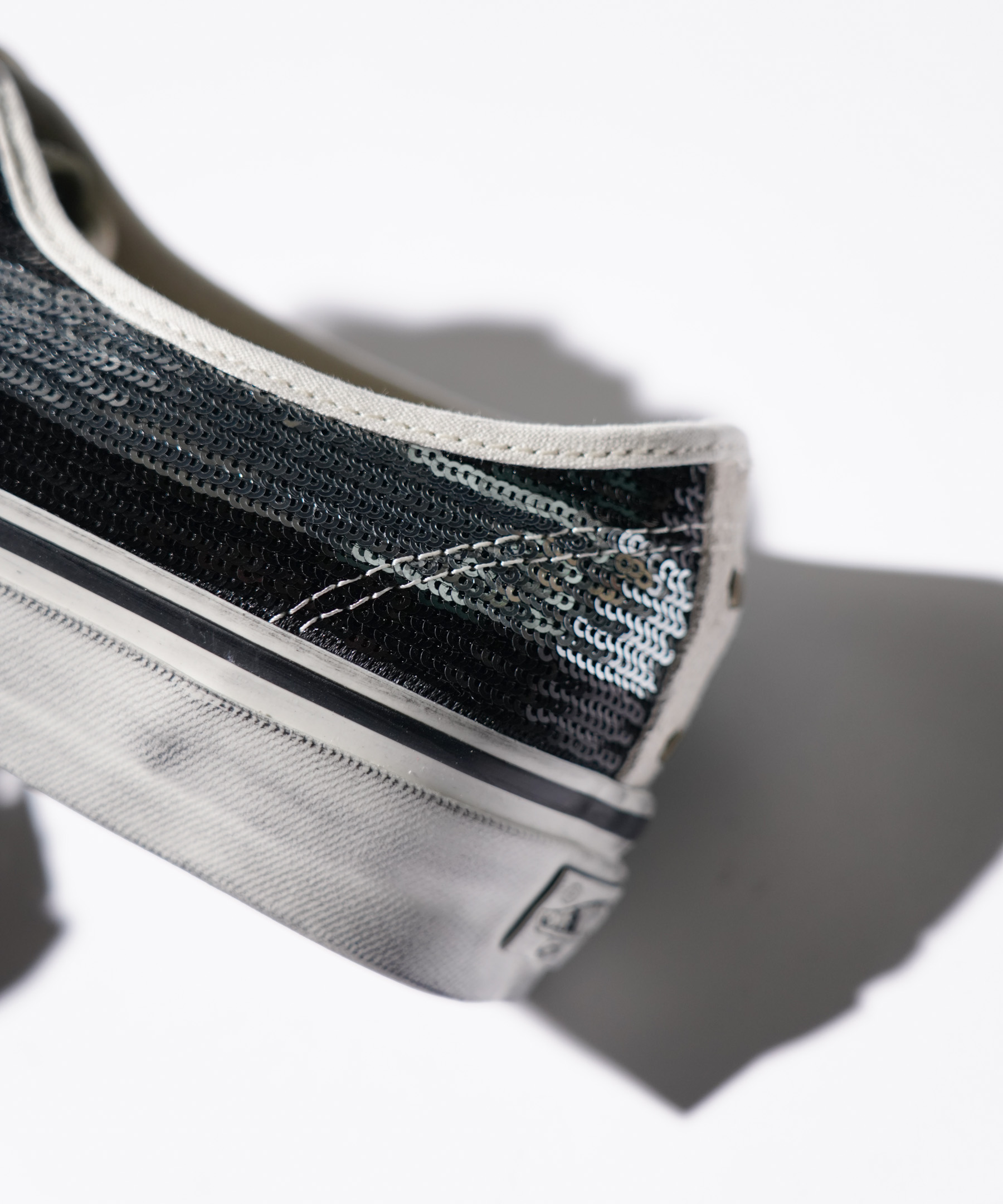 ・アッパーをスエードとスパンコールで切り替え、ラバーテープにはユーズド加工を施したモデル