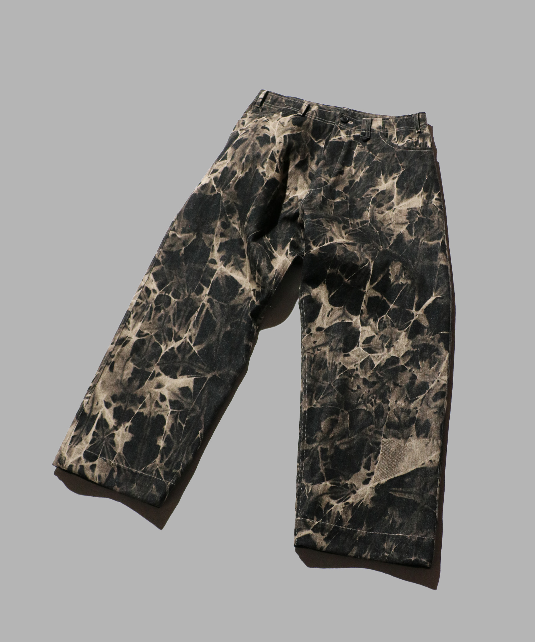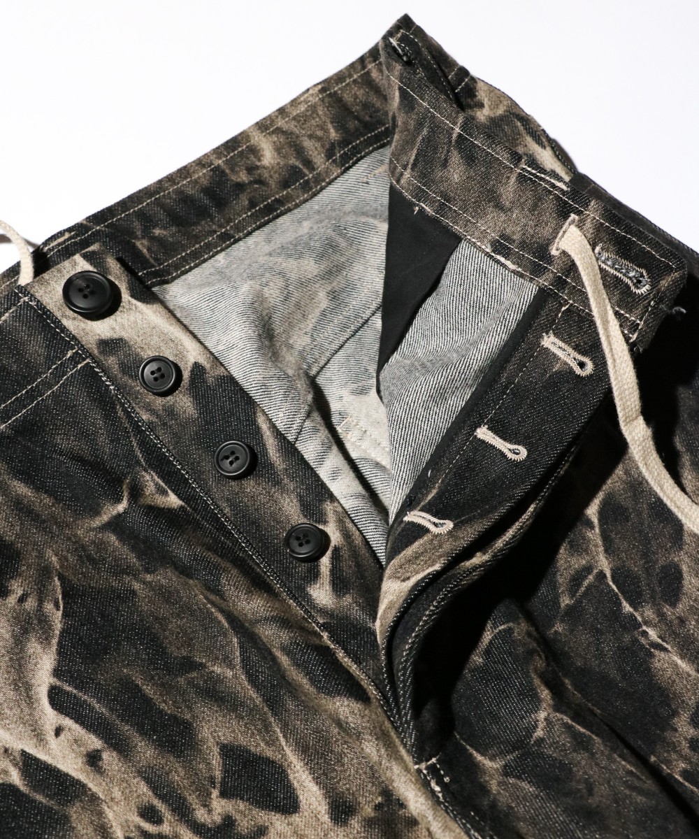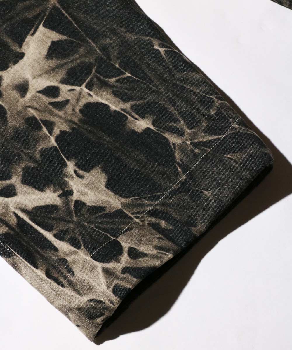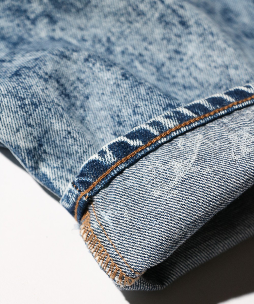ストーンウォッシュ加工とケミカルウォッシュ加工を施したデニムパンツ。