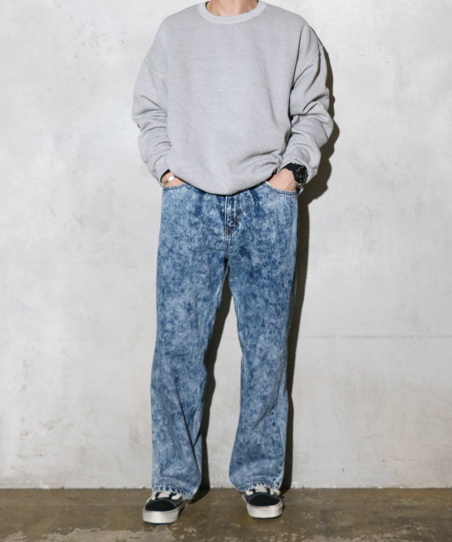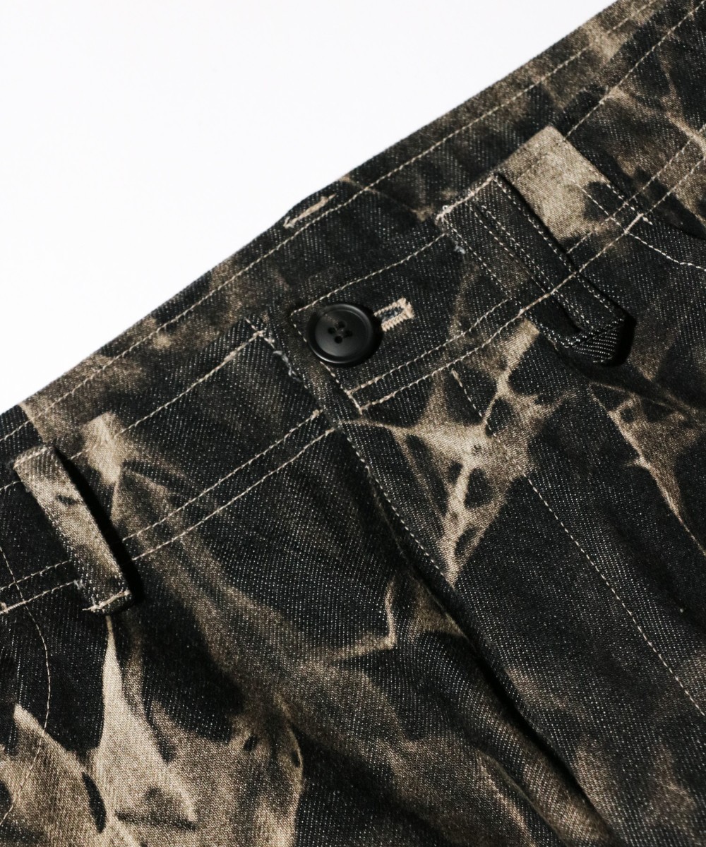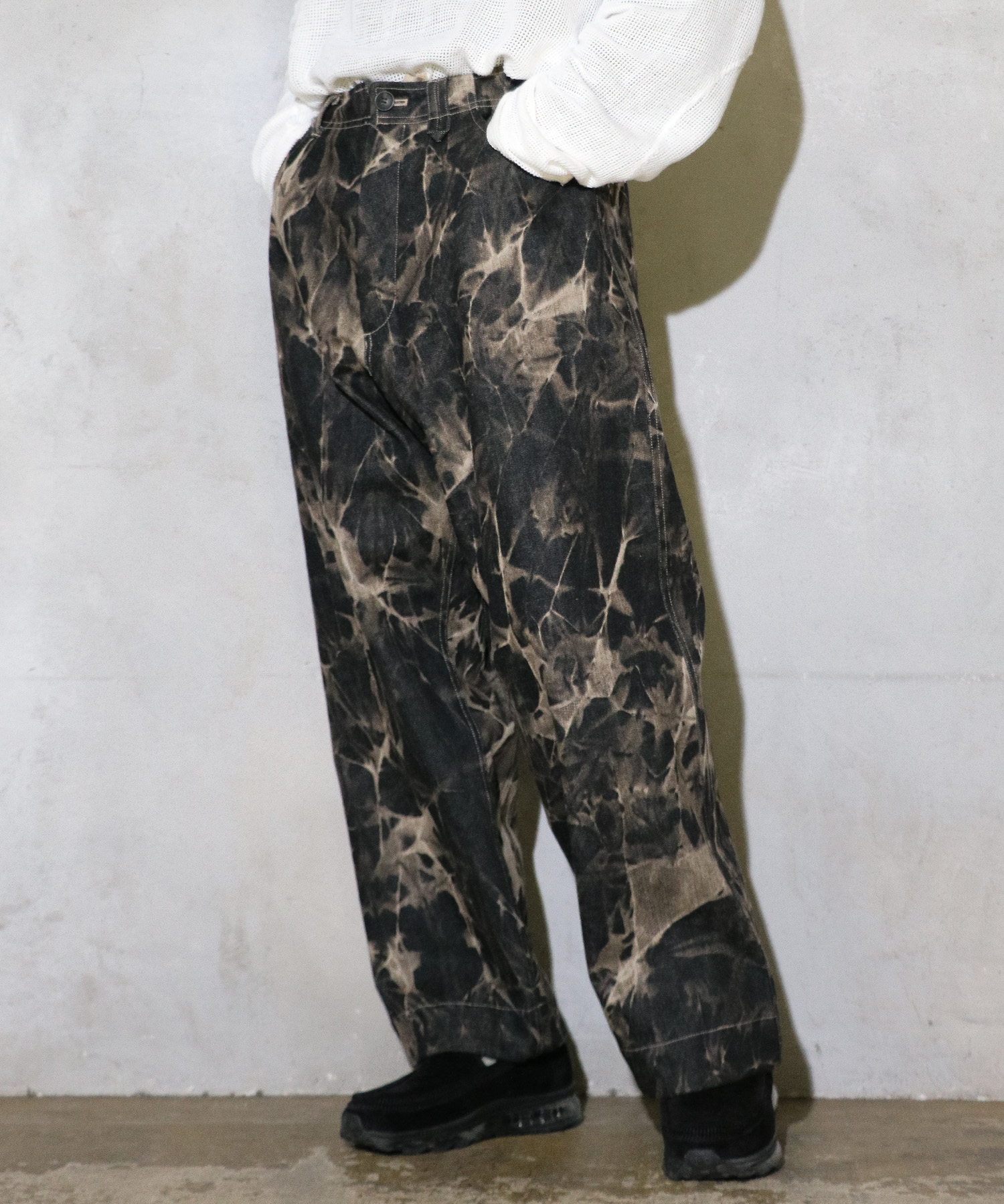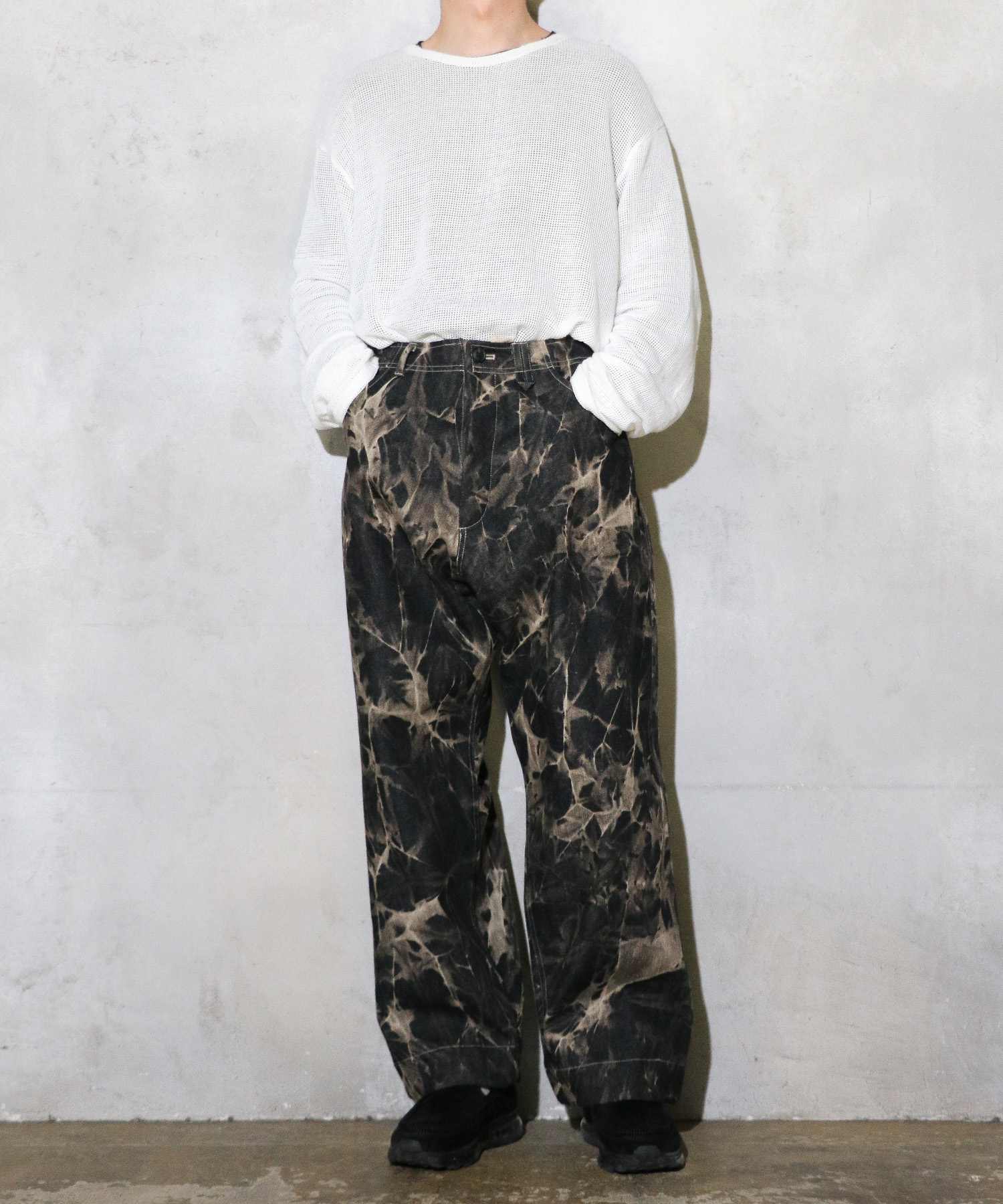 ストーンウォッシュ加工とケミカルウォッシュ加工を施したデニムパンツ。
